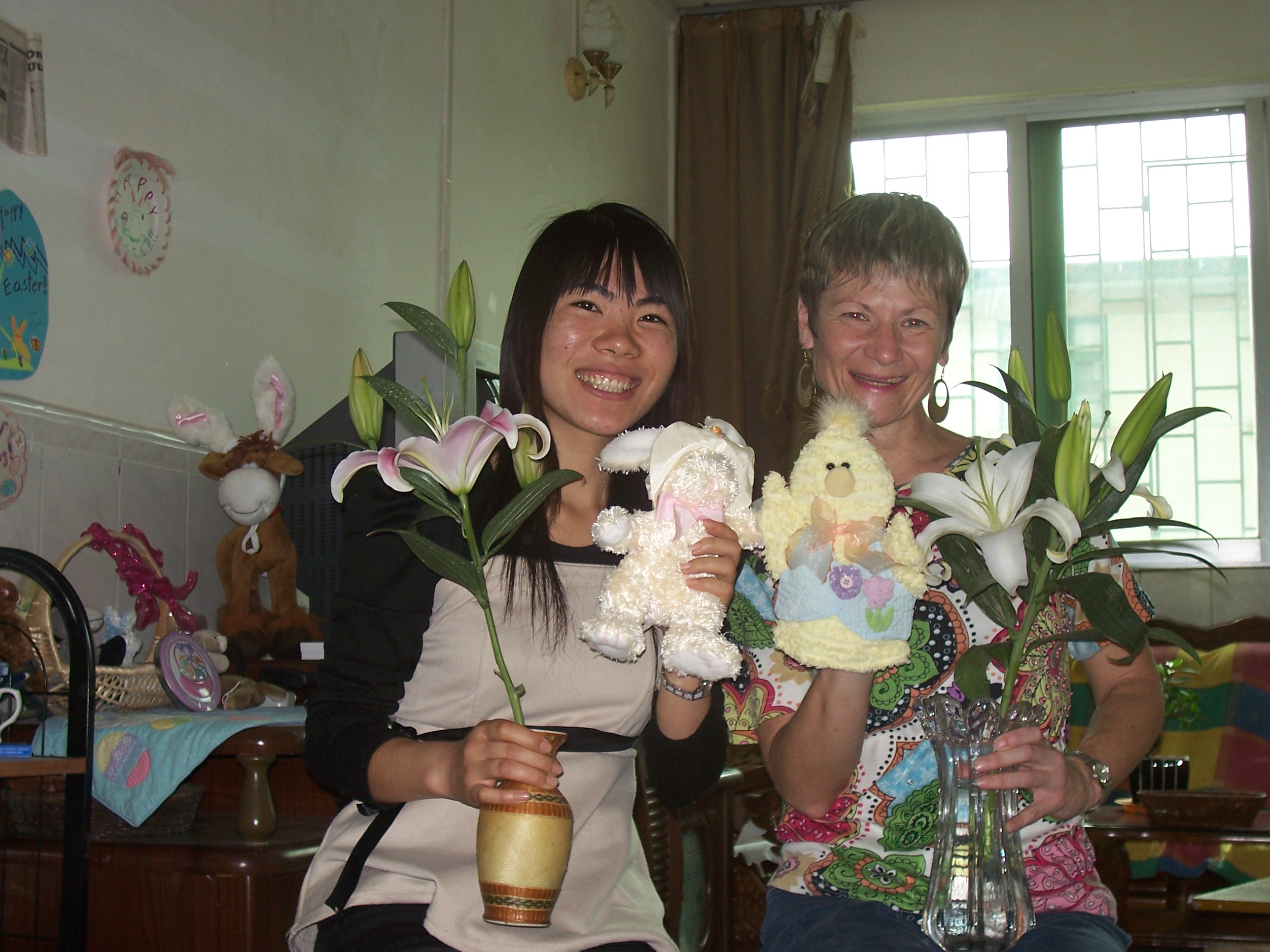 It didn’t take a second time to convince her to take her pink lilies. Cherry was too excited with the gift to fight with me about accepting them and I was too determined to share with her my personal Easter tradition in America.