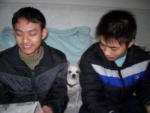 It was very sudden, with little warning. After my winter break, where she remained at her sitter’s for 4 weeks, we were back together again and it was a happy reunion for us both.  We had finally returned to Longzhou.   She and I were having a wonderful Saturday together.  We went for a walk.  We cuddled on the couch.  She entertained my regular teenage visitors, Joe and Tom, when they came for a visit.  In fact, I snapped her last photo with the two of them.