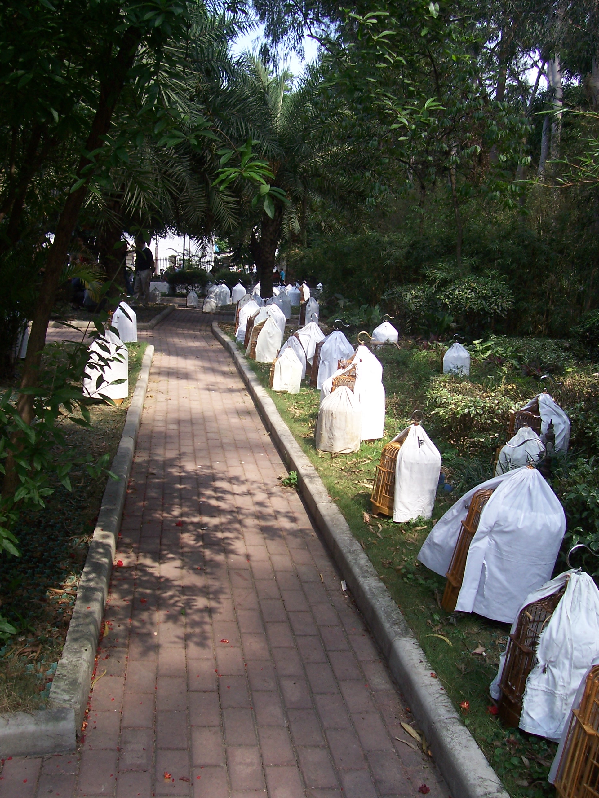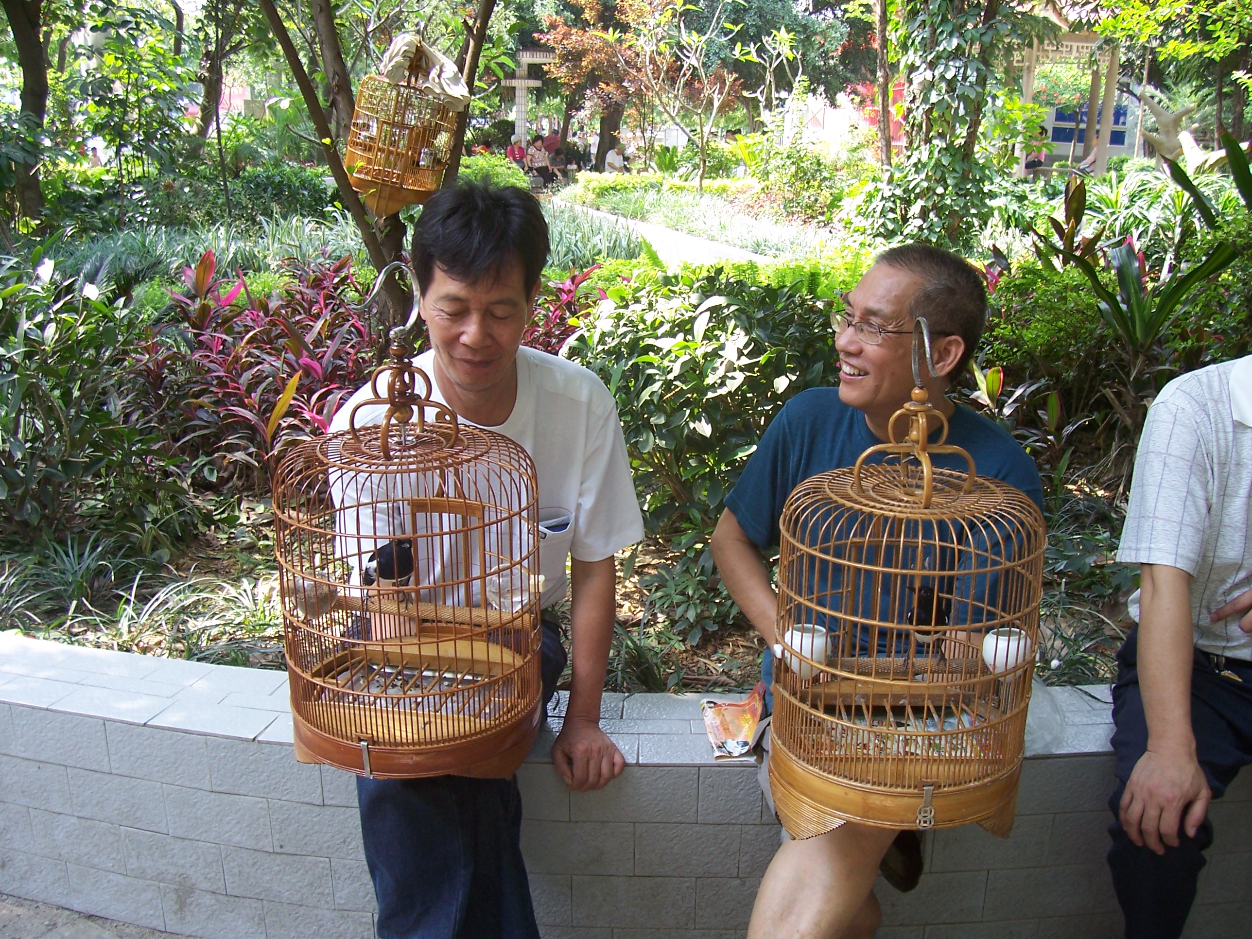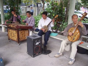 In the mornings, we had a more pleasant performance by the many bamboo caged birds brought on an outing by their owners. These lined the park walkways while their chaperones (all men) stood about, admiring their pets and talking to one another. Another nearby group of retired folk gave us their best renditions of Chinese music played on traditional instruments.