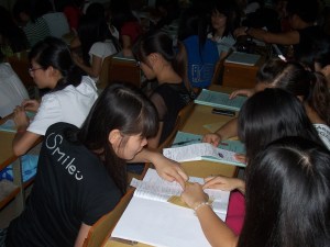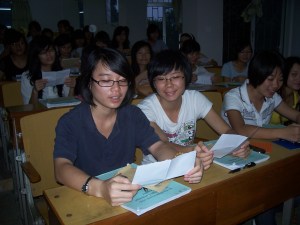 I wasn’t quite sure how they would like being grouped together instead of having their own private class time but as it turned out, our lecture hall’s atmosphere was quite lively and exciting when I entered at 6:30. My 1st year English Education majors didn’t seem to mind being all thrown together and their spirits were high.