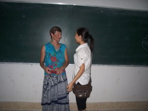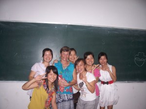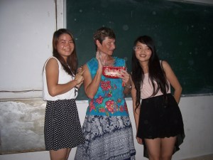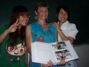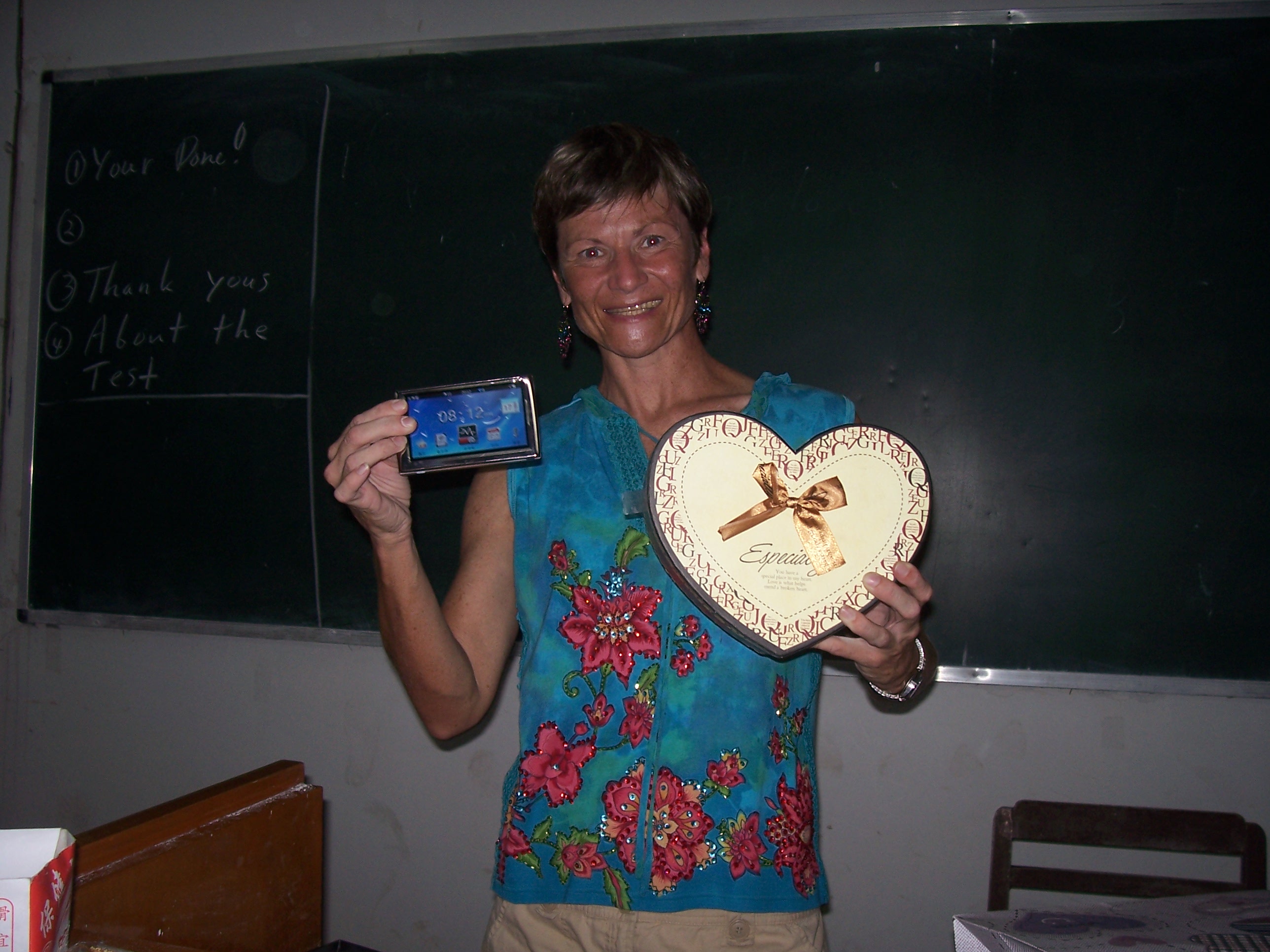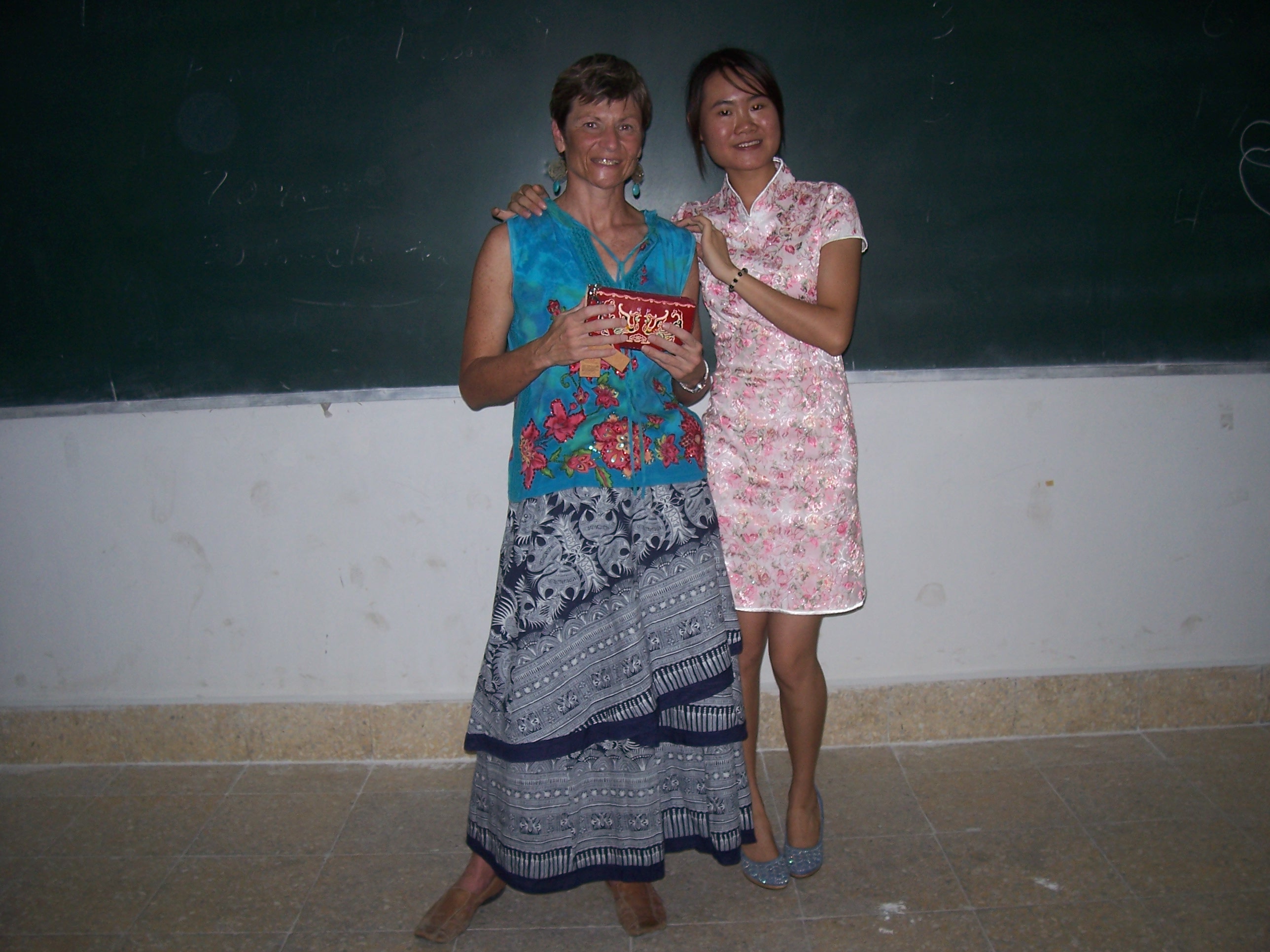As for my 2nd year students, they all know me extremely well as we’ve been together for 2 years. Their class gifts were certainly on target. Class 101 gave me a photo album of pictures we’d had together over the past 2 years, as well as photos they have of themselves. Class 102 gave me some lovely earrings (they know my passion for cool, dangling earrings) and a small leather purse etched in phoenixes. And Class 103 chose a beautiful long, ethnic skirt from Guangxi which suited me perfectly. I immediately put it on, removing the skirt I was wearing behind the teacher’s desk, and showed off my new one, along with the gift earrings, purse and photo album, much to the delight of everyone present.