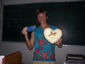 My English Education 111 class put together an album with all their photos in it and wrote little notes of thanks to me under each picture. The English Education 112 class gave me a huge heart box filled with assorted hard candy. (That ended up being eaten by my 2nd year students at 8:30 because some were starving and wanted something to munch on.) My Practical English class likewise gave me candy and individual notes from each person in the class, saying very sweet farewells.