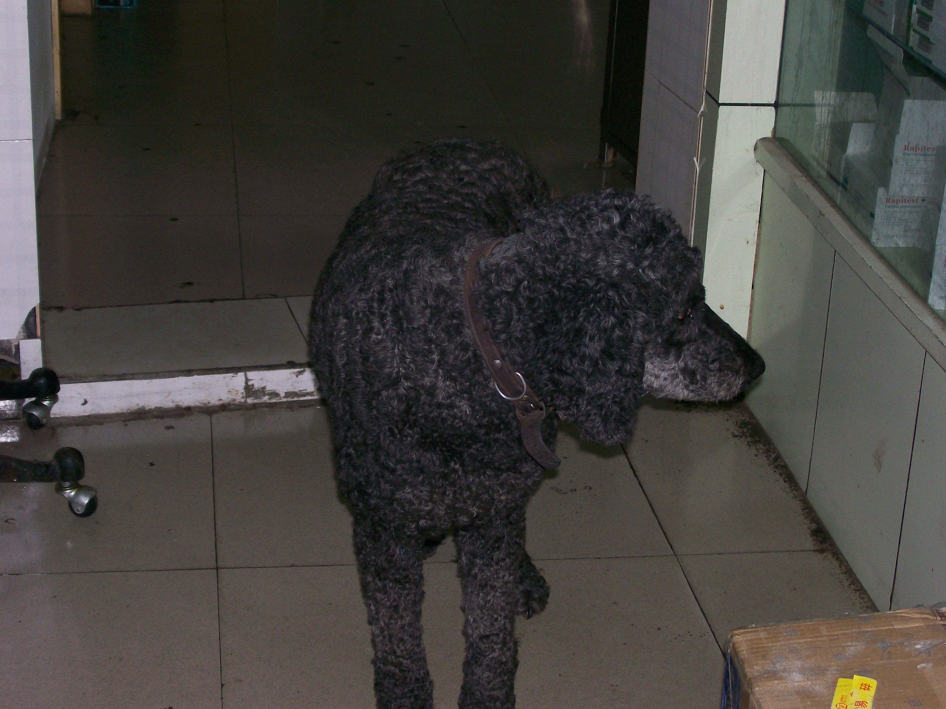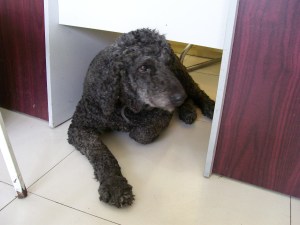 Ancient Clock Tower is the mascot of the clinic. He is a hefty mix of standard poodle and something else. His wiry, short-cropped, curly coat doesn’t give much warmth during our chilly Sichuan weather, especially with no heat inside, but he doesn’t seem to mind at all. He is a contented dog and a lover, freely wandering the clinic from his open cage to beg attention from whoever walks in the door.