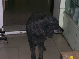 It seems that our big, black, poodle mix had been found 4 years ago at the tower by his friend. The poor thing was about 30 pounds, in very poor shape – just skin and bones and very weak. He was brought to the clinic where the 3-vet trio, Dr. Mao, Dr. Zhang and Dr. Huang, took care of him. He became a part of their medical family and has been here ever since.