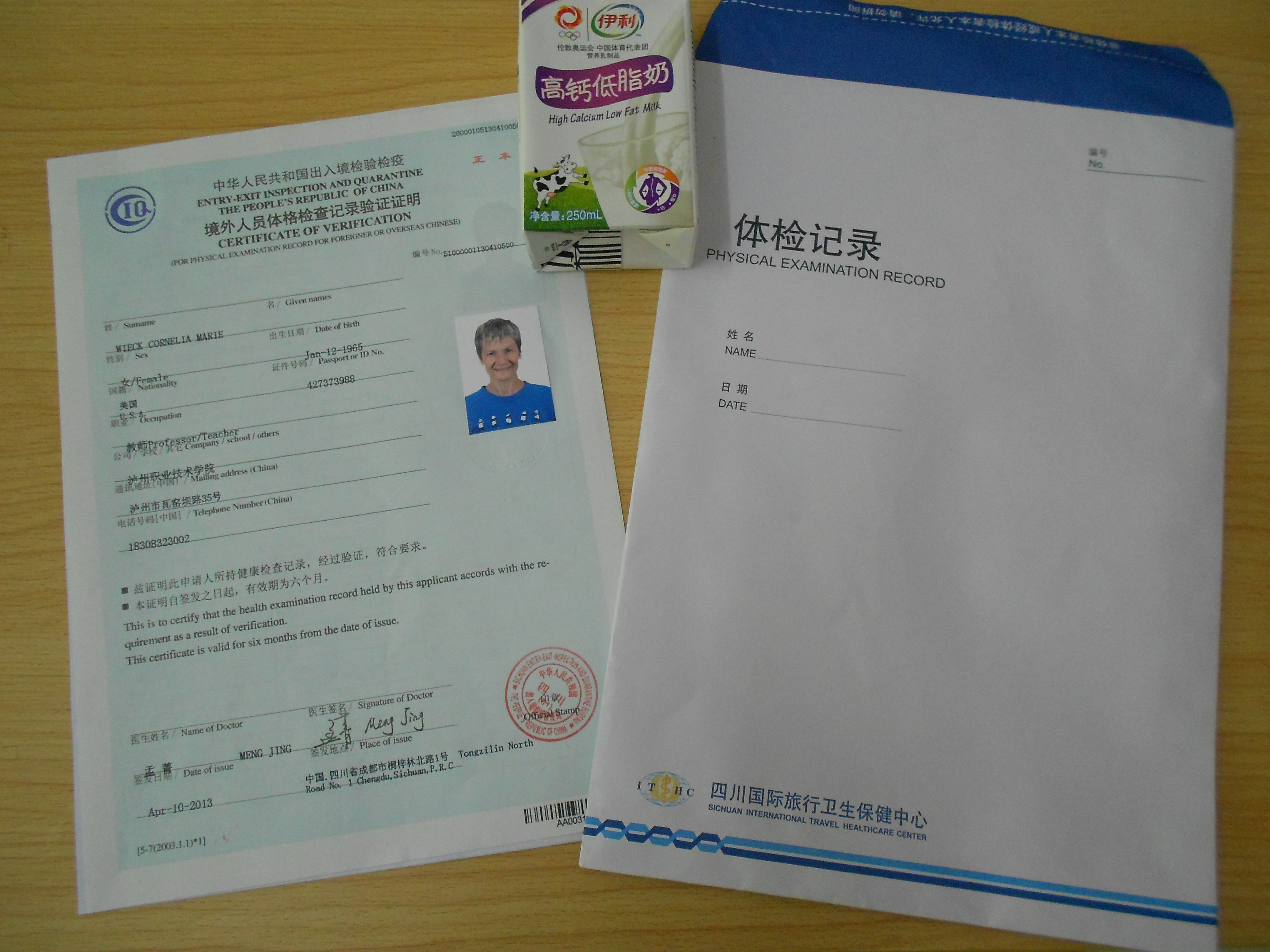 In my previous exams years ago, the exam had remained a steady 280 yuan, roughly $40 with the exchange rate of that time. Now the cost was 411 yuan, $66. Some improvements included better urine cups (these had lids), new EKG machine, computerized X-rays (no films) and a big envelope to put your results in after certification pick-up.