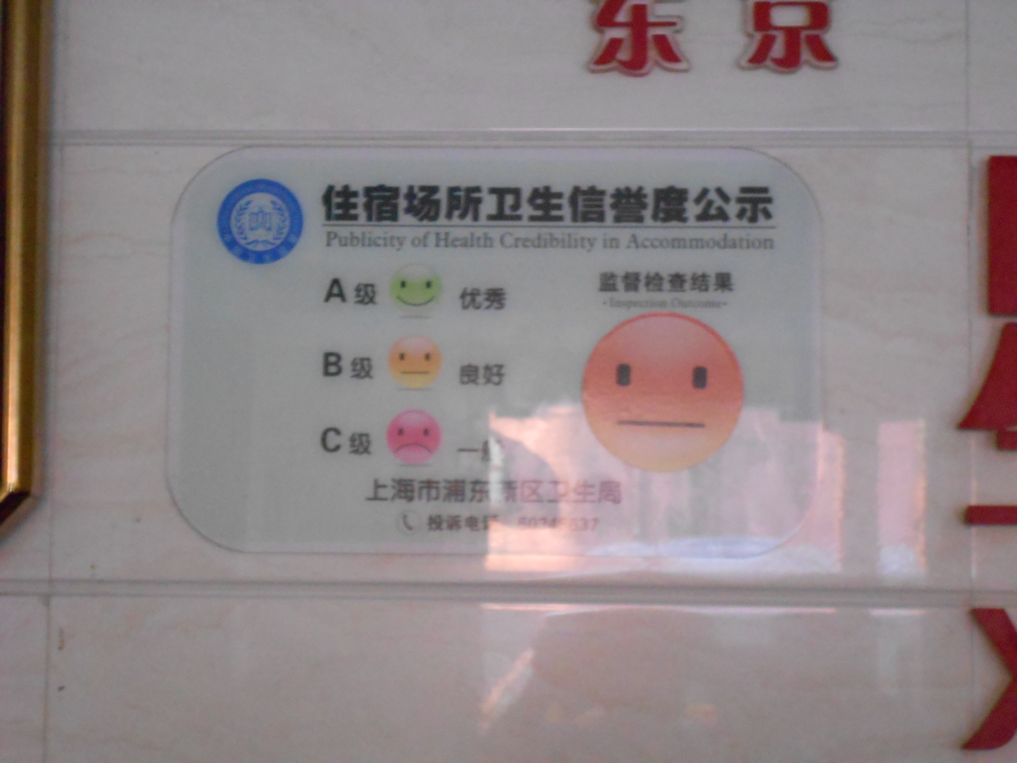 An example of China’s sanitation inspection sign. This was my overnight hotel in Shanghai, which received a “B” (so-so) rating.