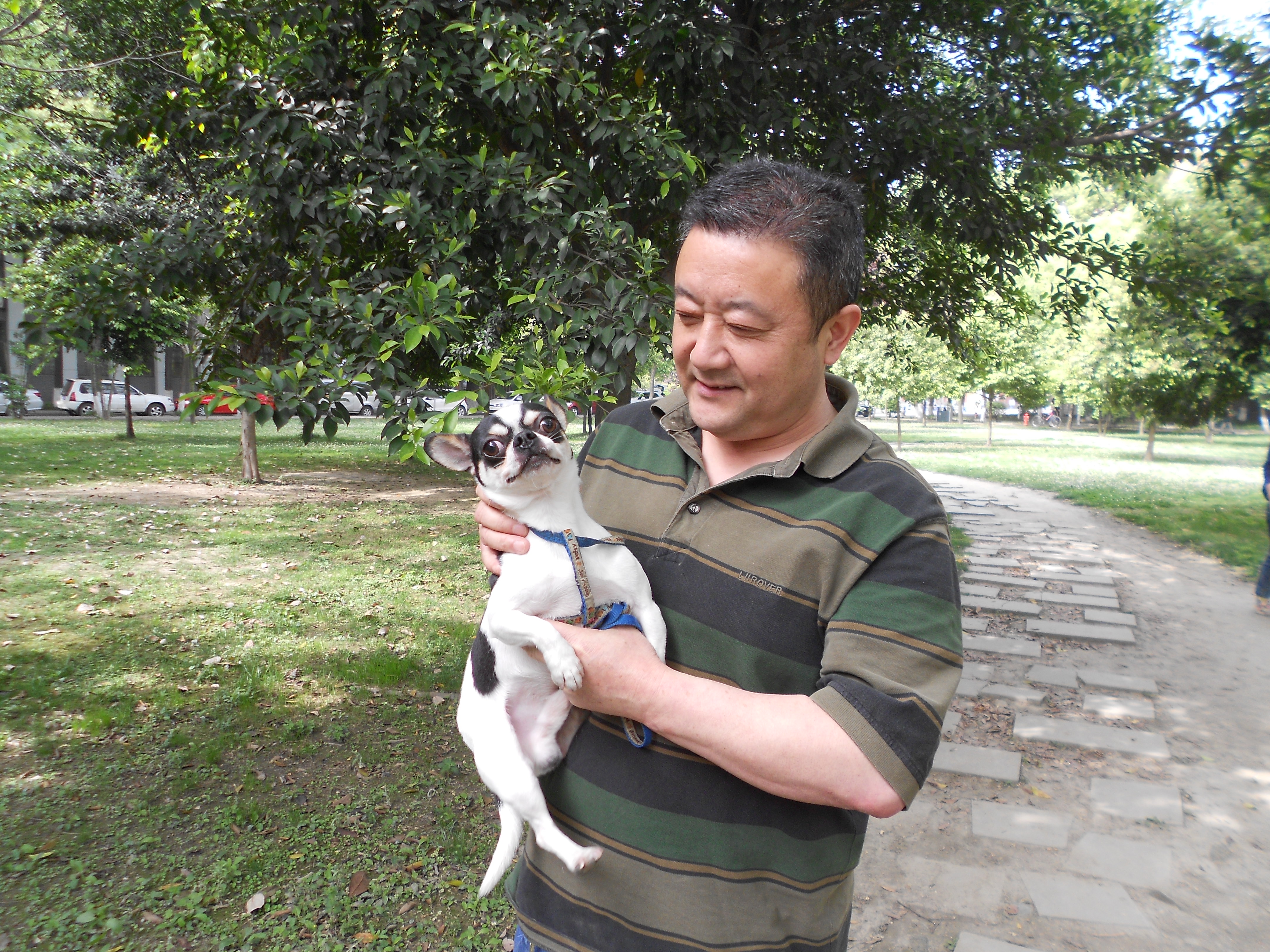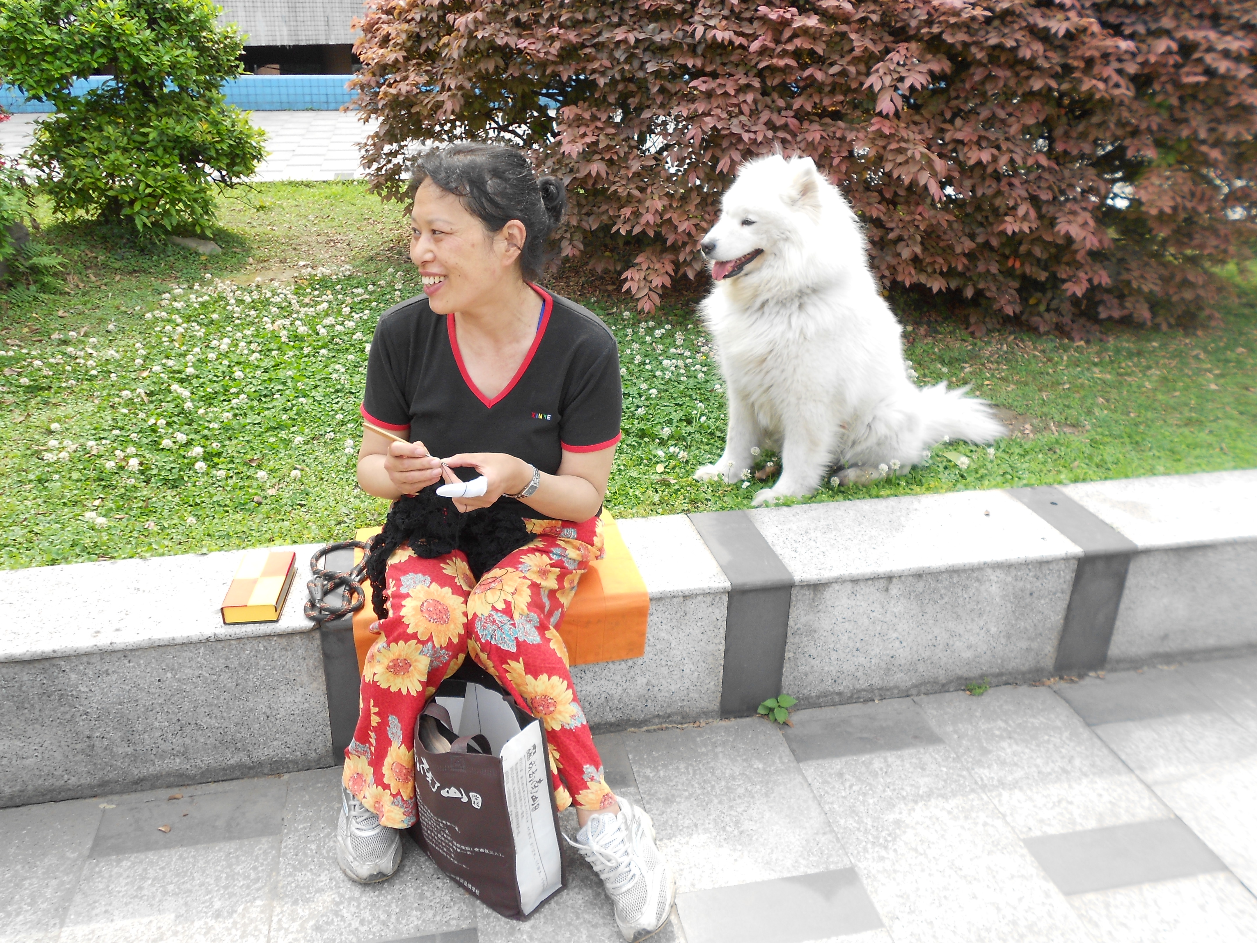 My two favorites are 57-year-old Ms. Zhao and Mao Dou (Hairy Bean), her poodle, as well as 26-year-old Sha-sha and Hua-hua (Flower), her half-corgi mix. We have been meeting up every day at 3 p.m. to enjoy watching the doggies play while chit-chatting. Joining us has also been Frank (Gao Pei), a Sichuan University student whom I mentioned before. Both he and Sha-sha enjoy practicing their English while Ms. Zhao and I work on my pitiful Chinese.