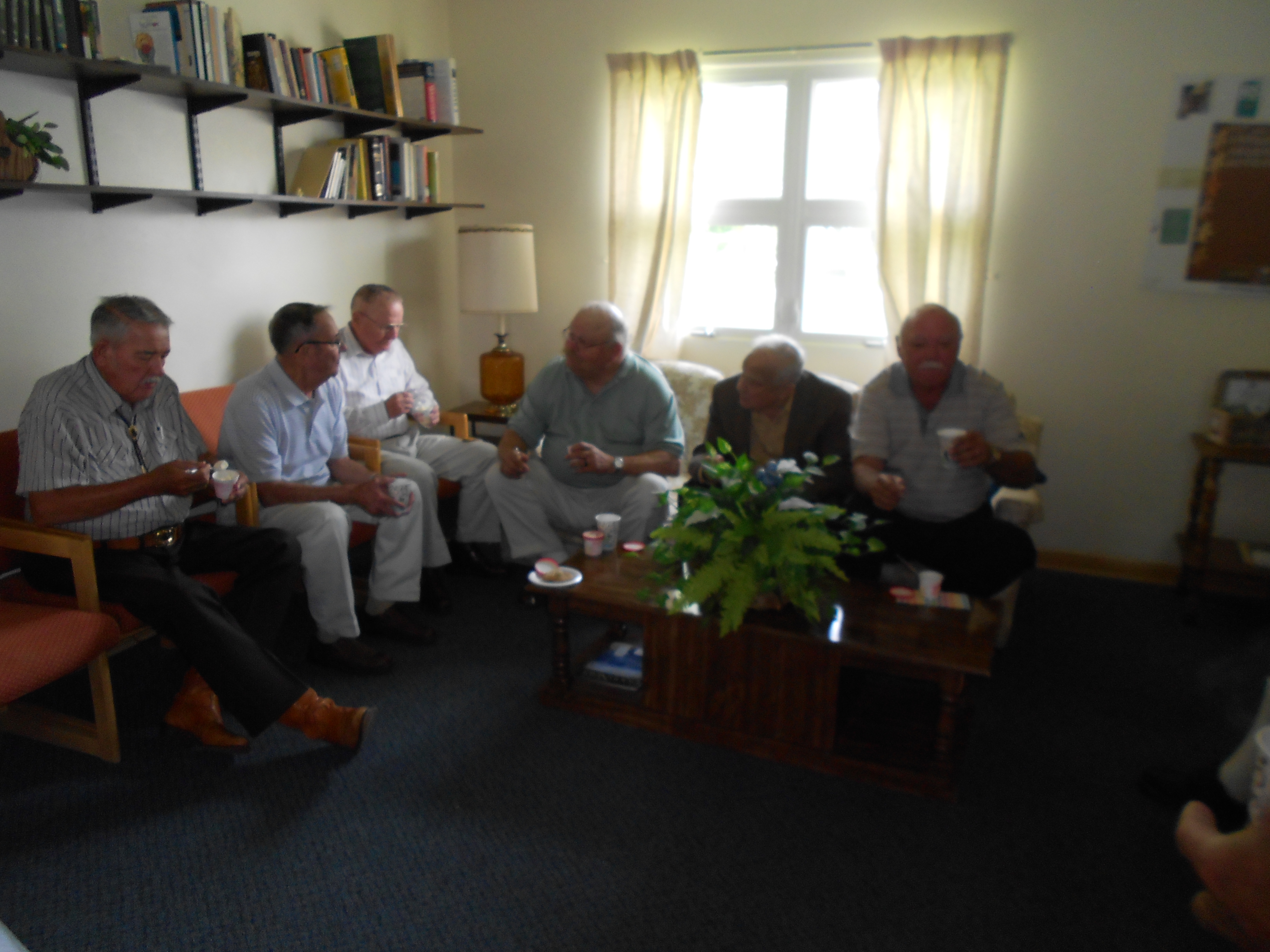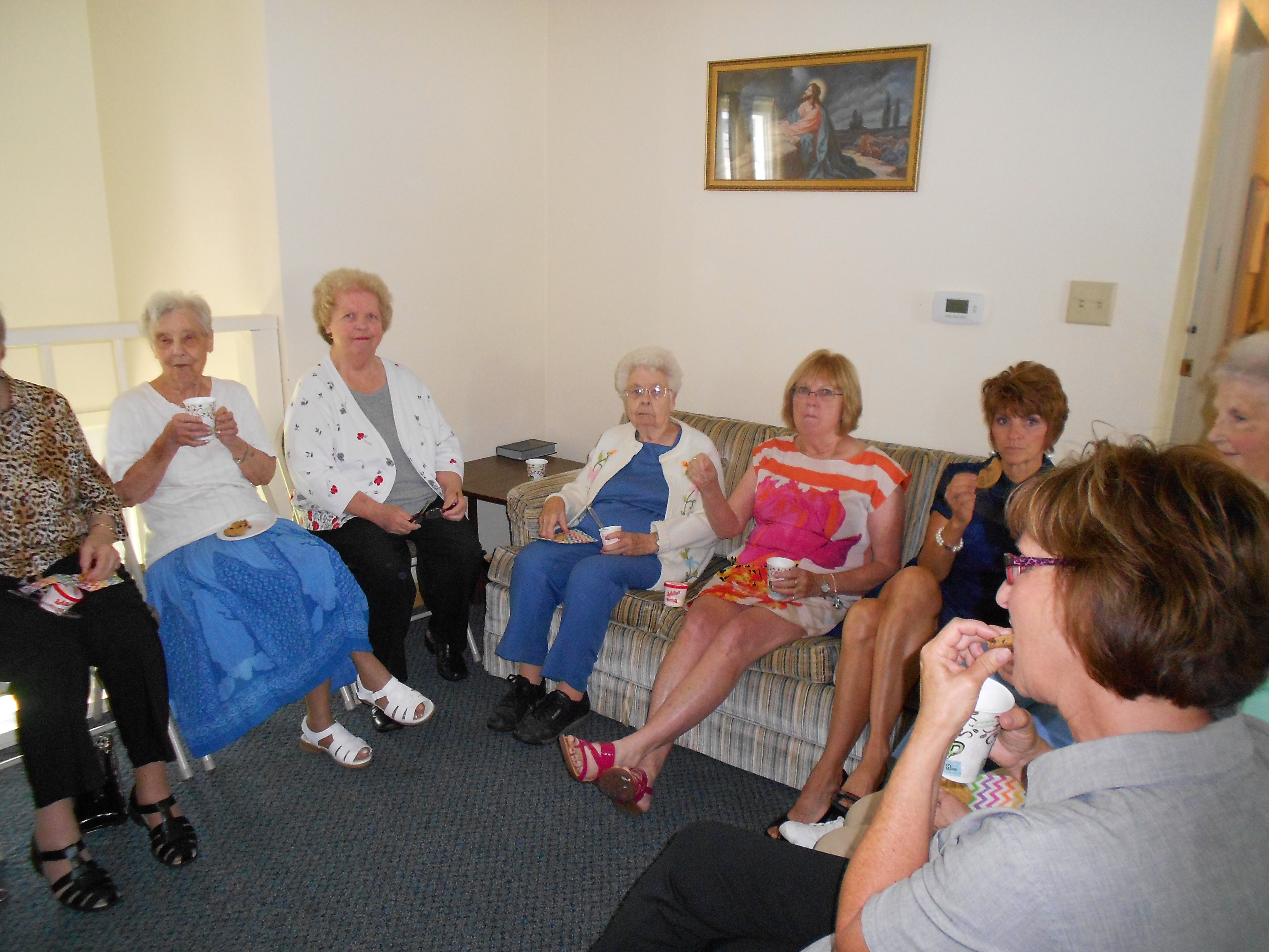 Fellowship time after the service includes lots of coffee and cookies. Gals to the left of the room . . .