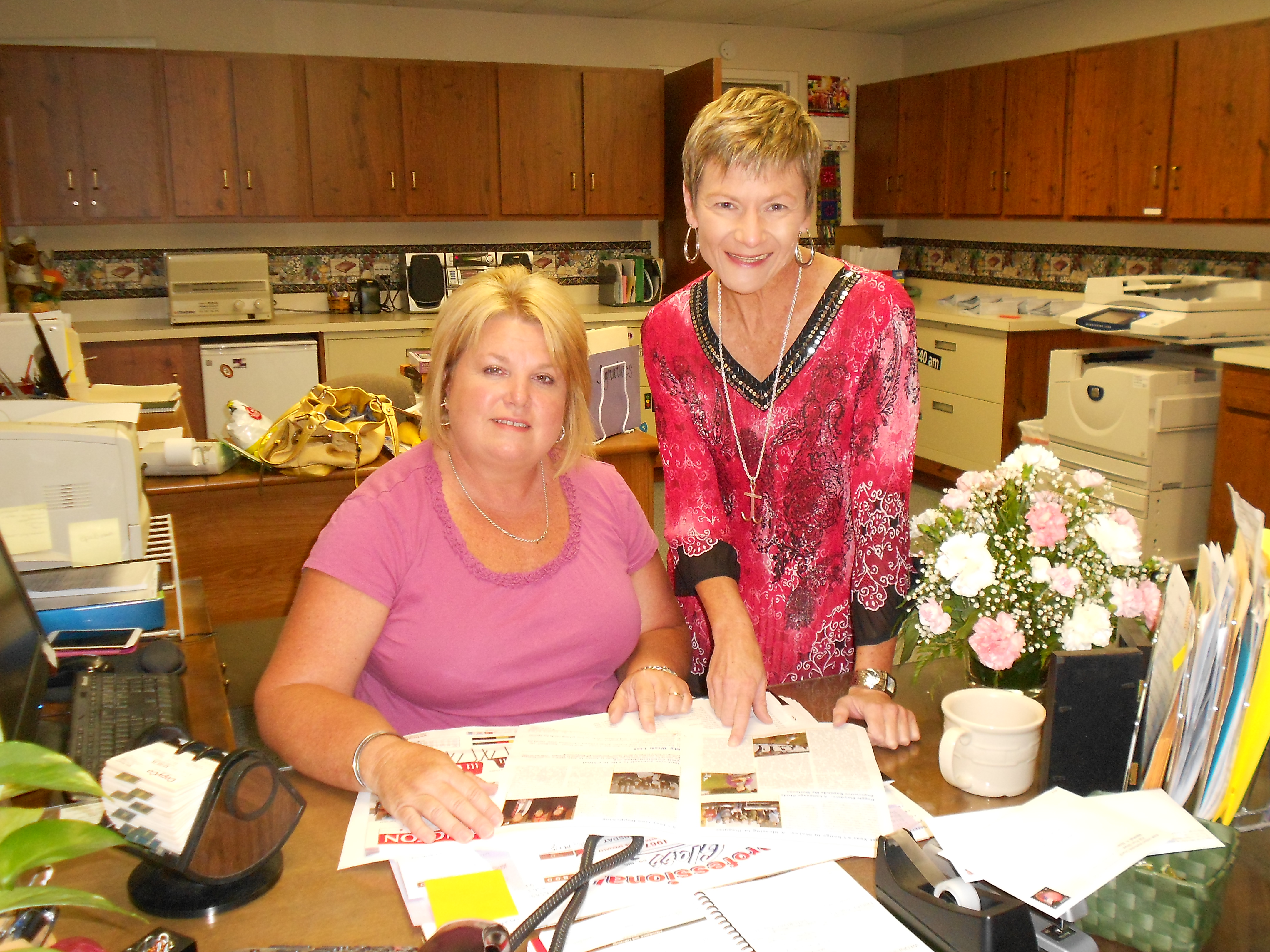 Kelley Ray (seated) and me going over the last touches of my summer newsletter in the church office.