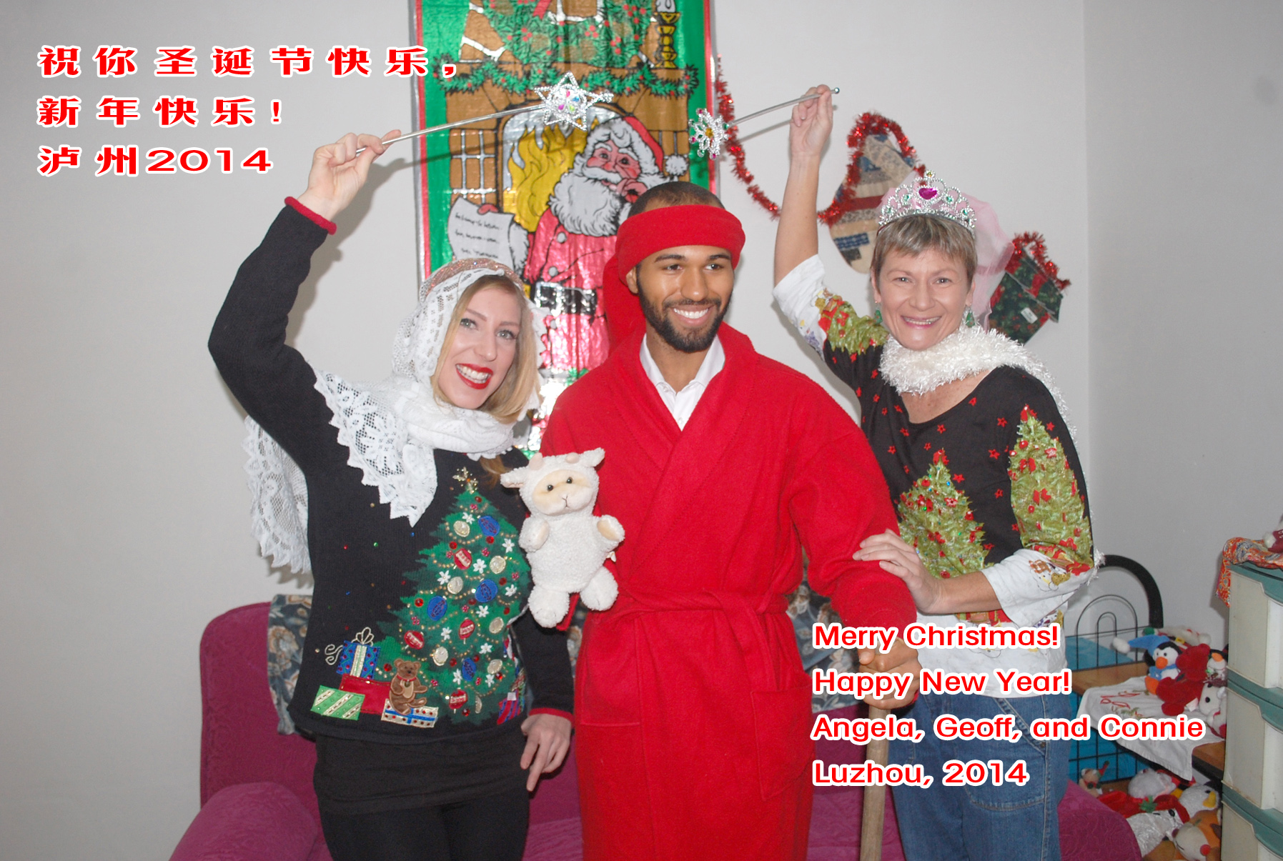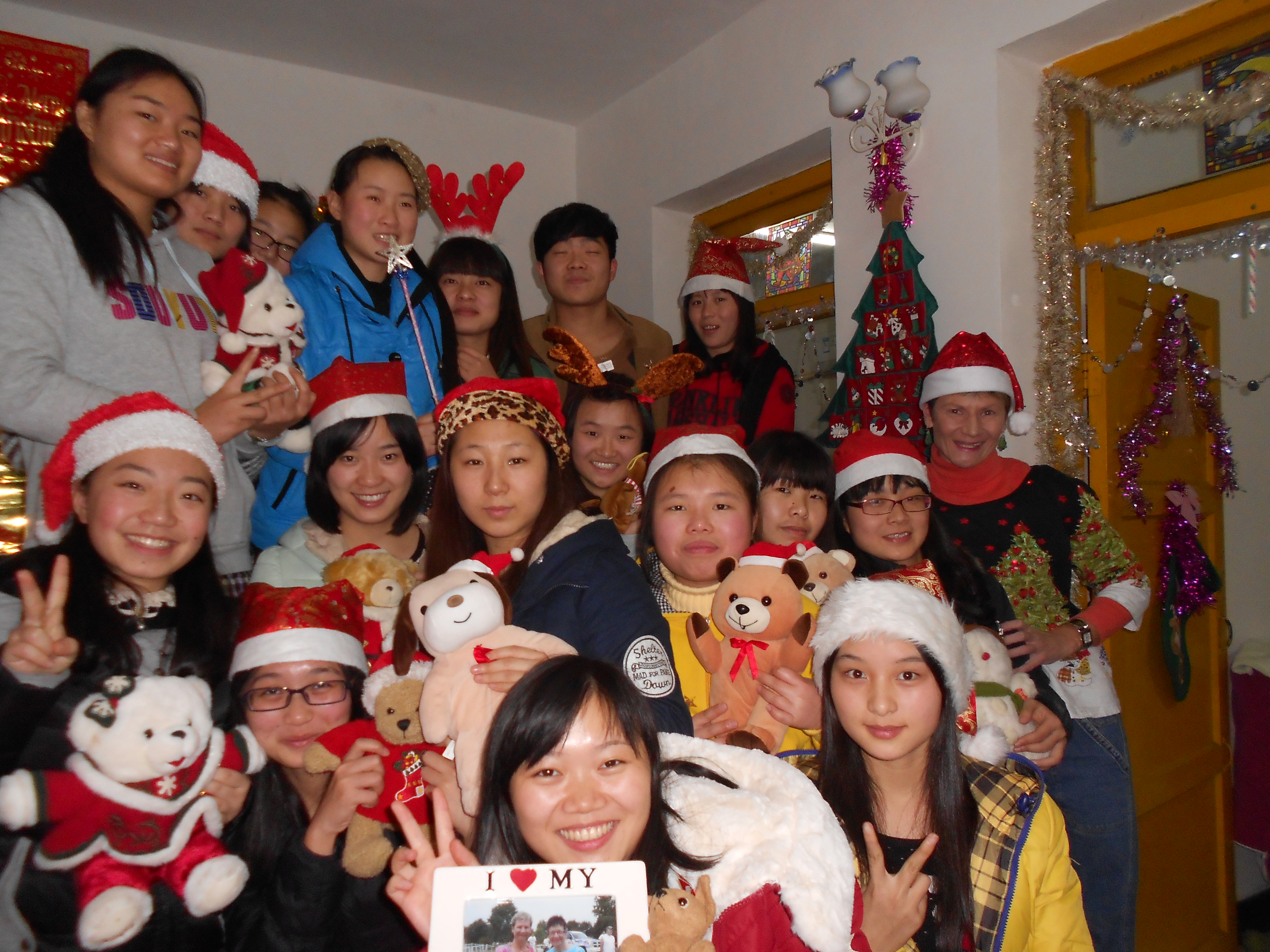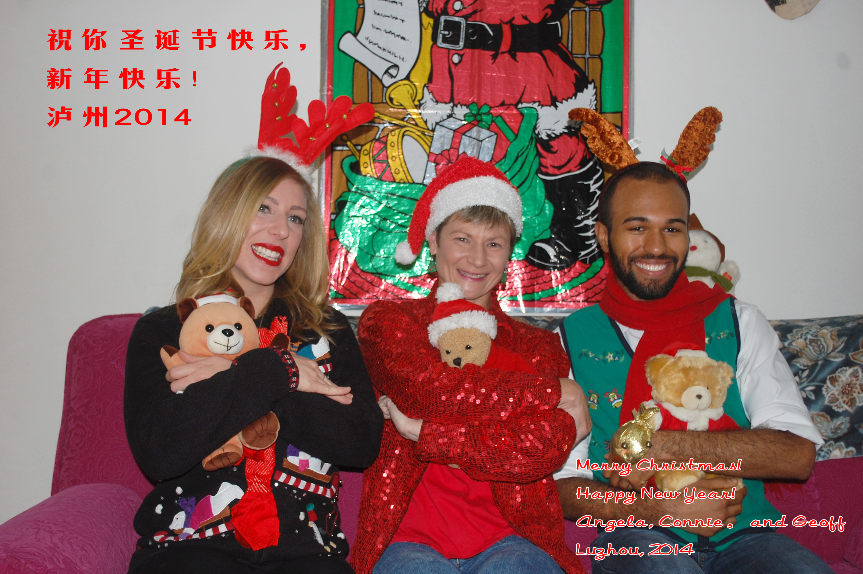 When I was on my own, I’d have holiday photos taken of me and Little Flower which were laminated and copied for every student I had. Now, there are 3 foreign teachers at our college. Two years ago, I blogged about the photo session with me, John and Ashley in my home. John set up his state-of-the-art camera on a tripod and we maneuvered ourselves into numerous poses for pictures.