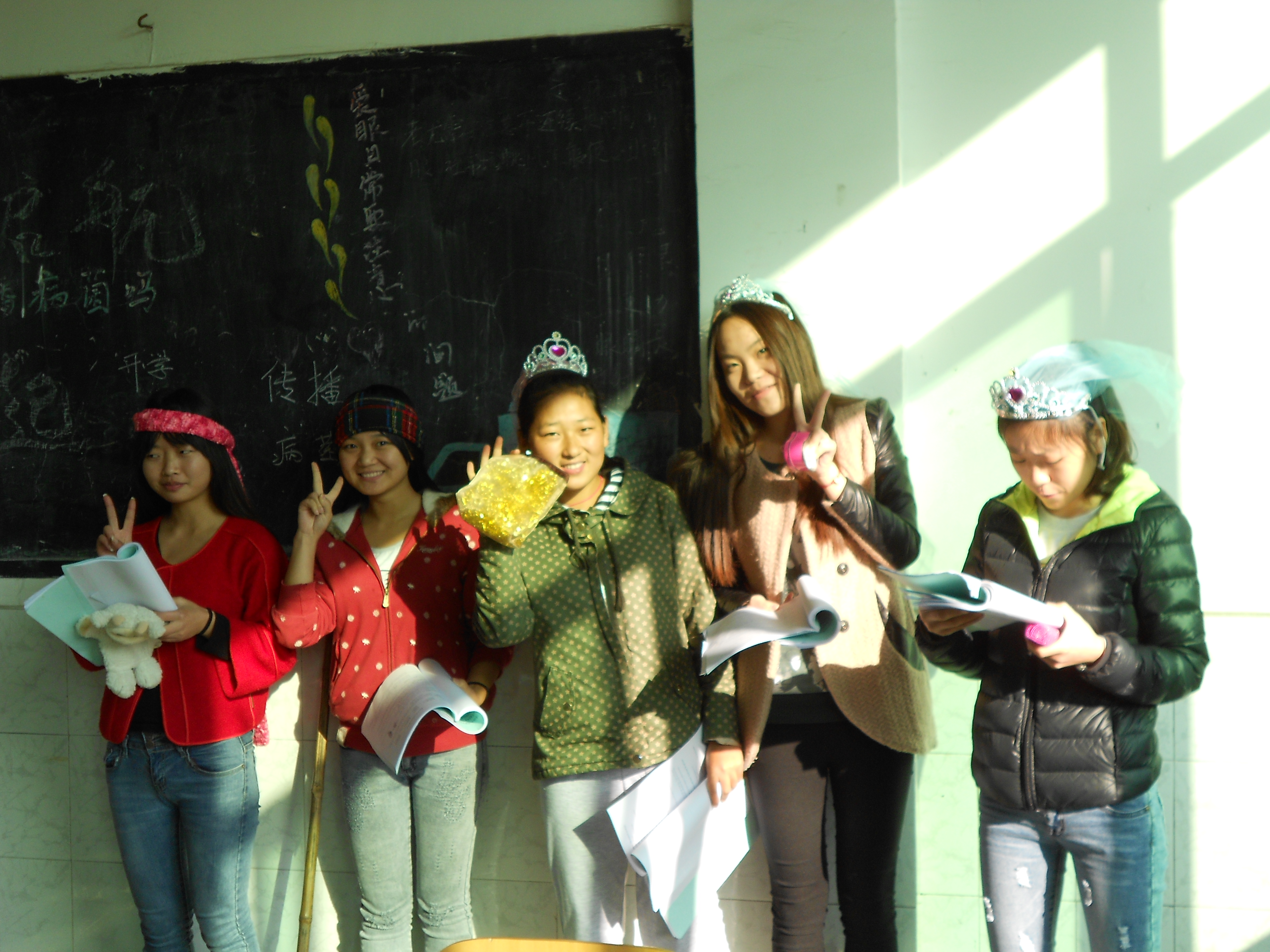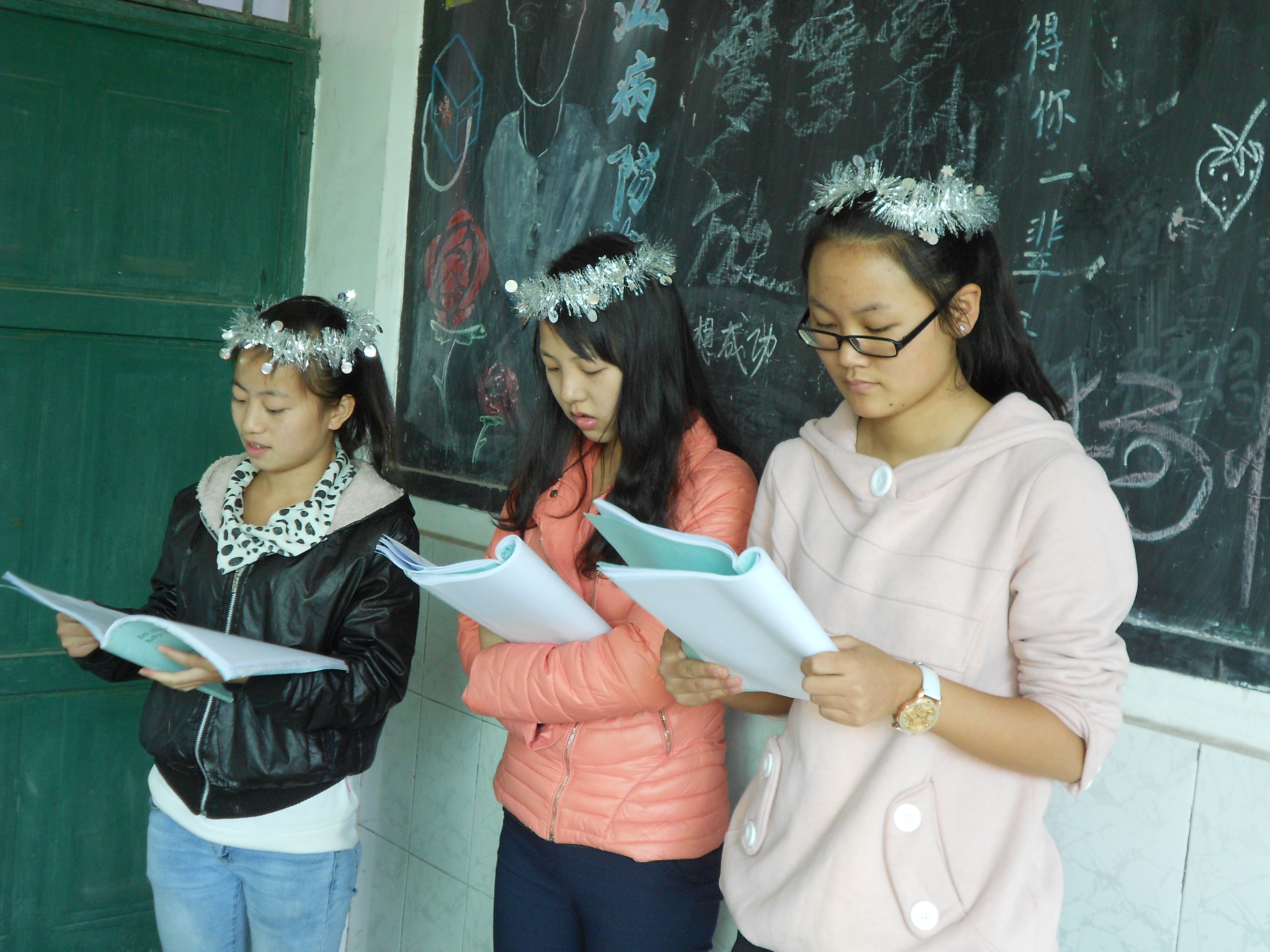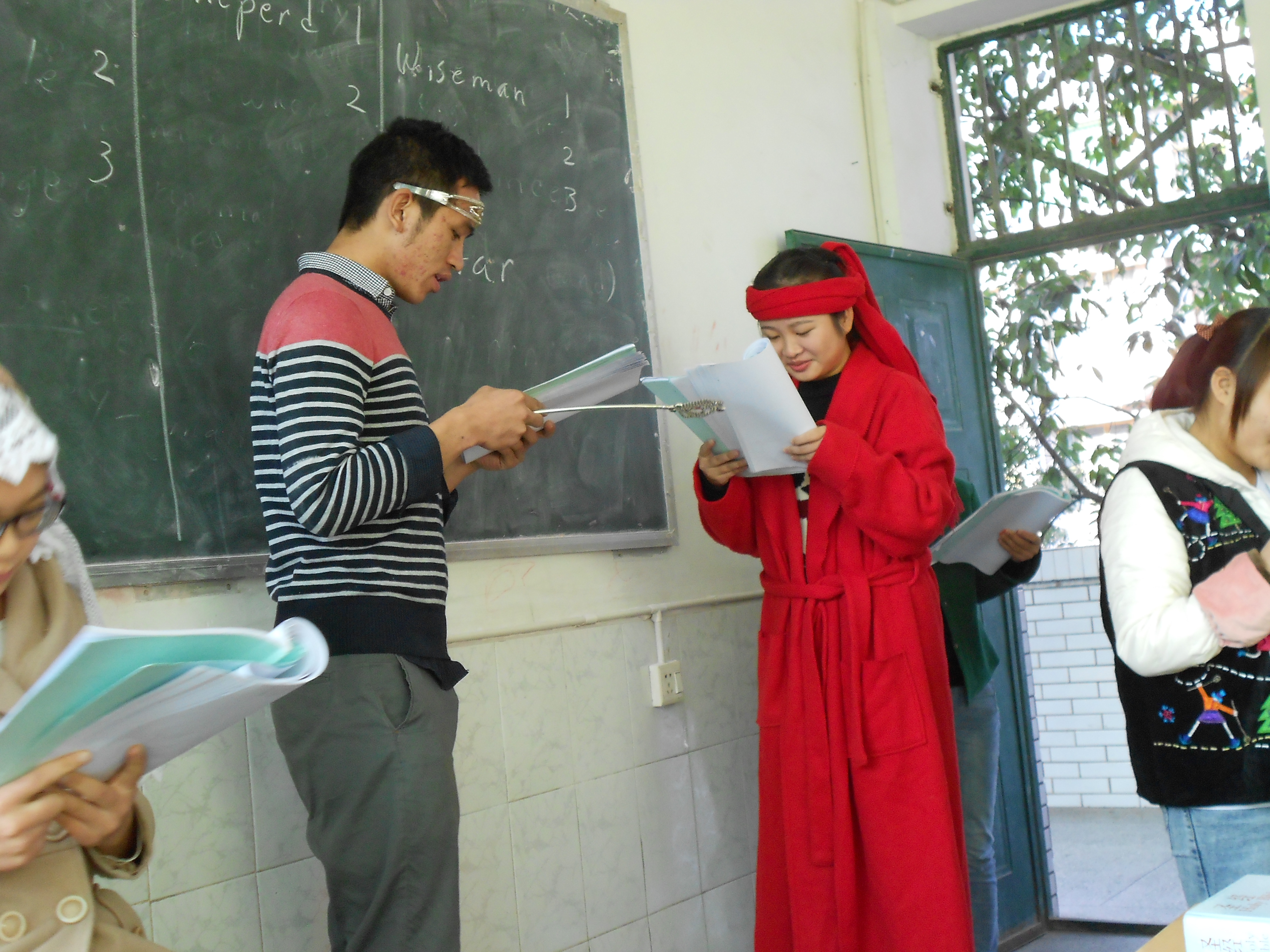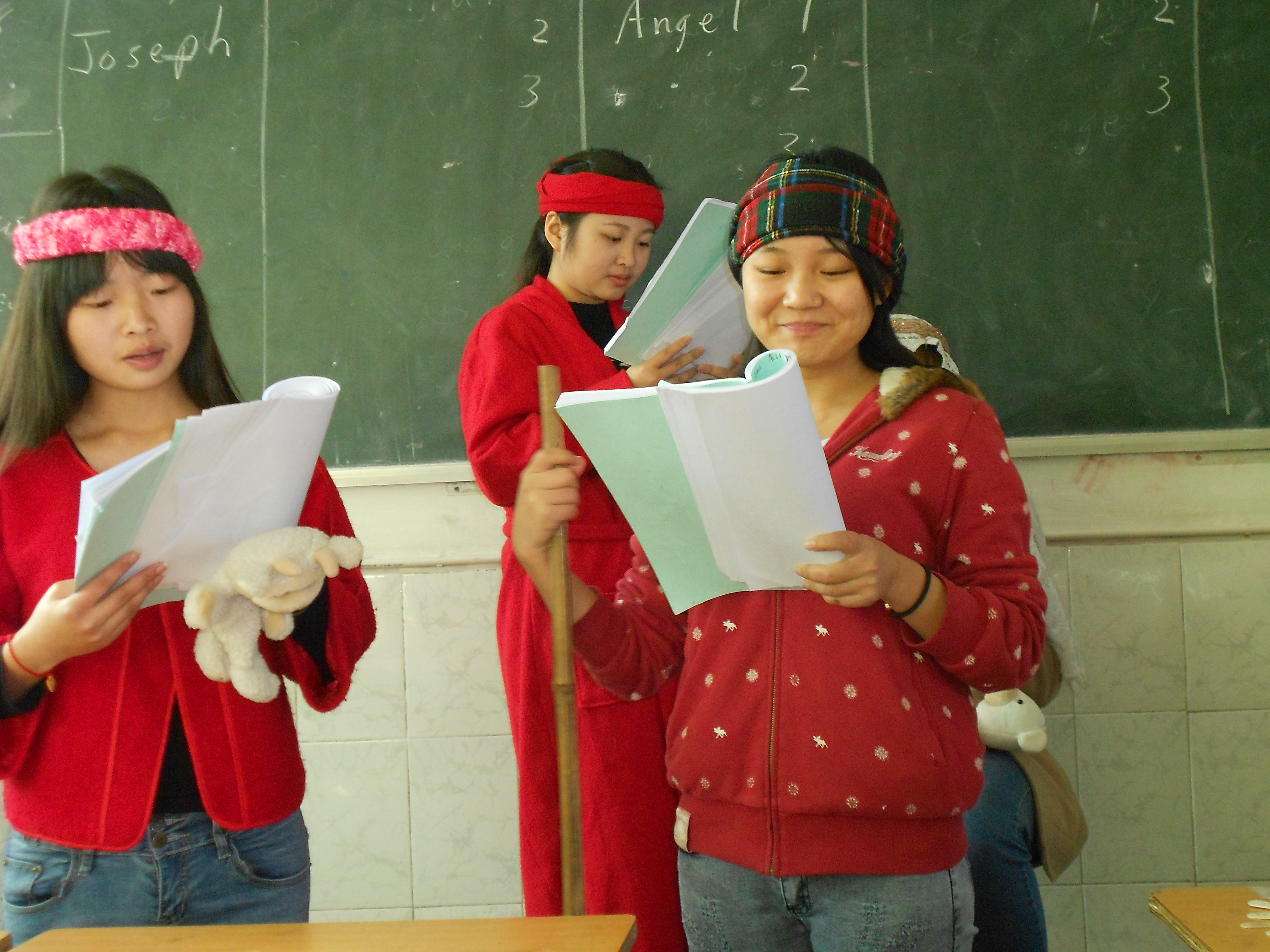 When I was on my own, I’d have holiday photos taken of me and Little Flower which were laminated and copied for every student I had. Now, there are 3 foreign teachers at our college. Two years ago, I blogged about the photo session with me, John and Ashley in my home. John set up his state-of-the-art camera on a tripod and we maneuvered ourselves into numerous poses for pictures.