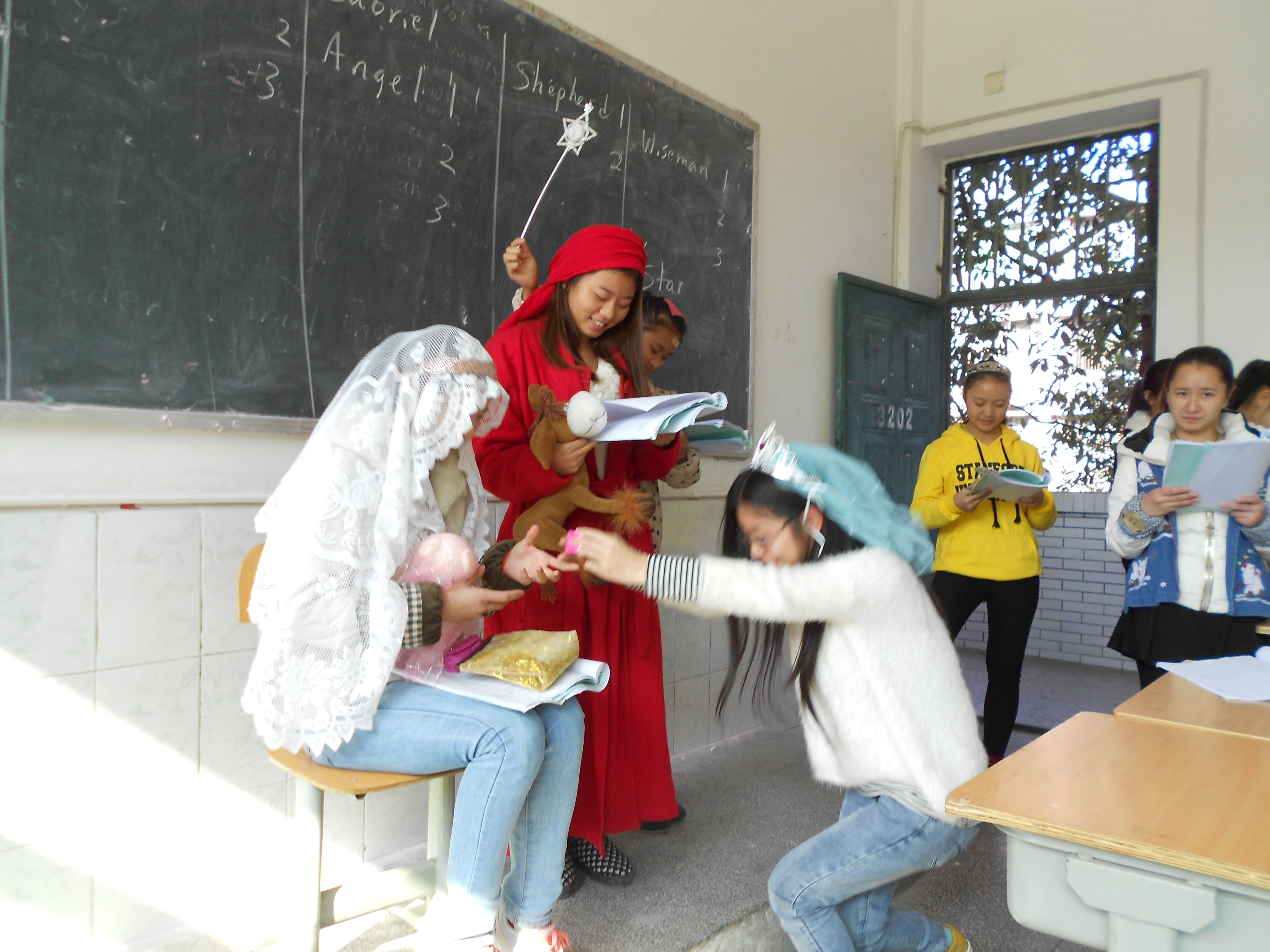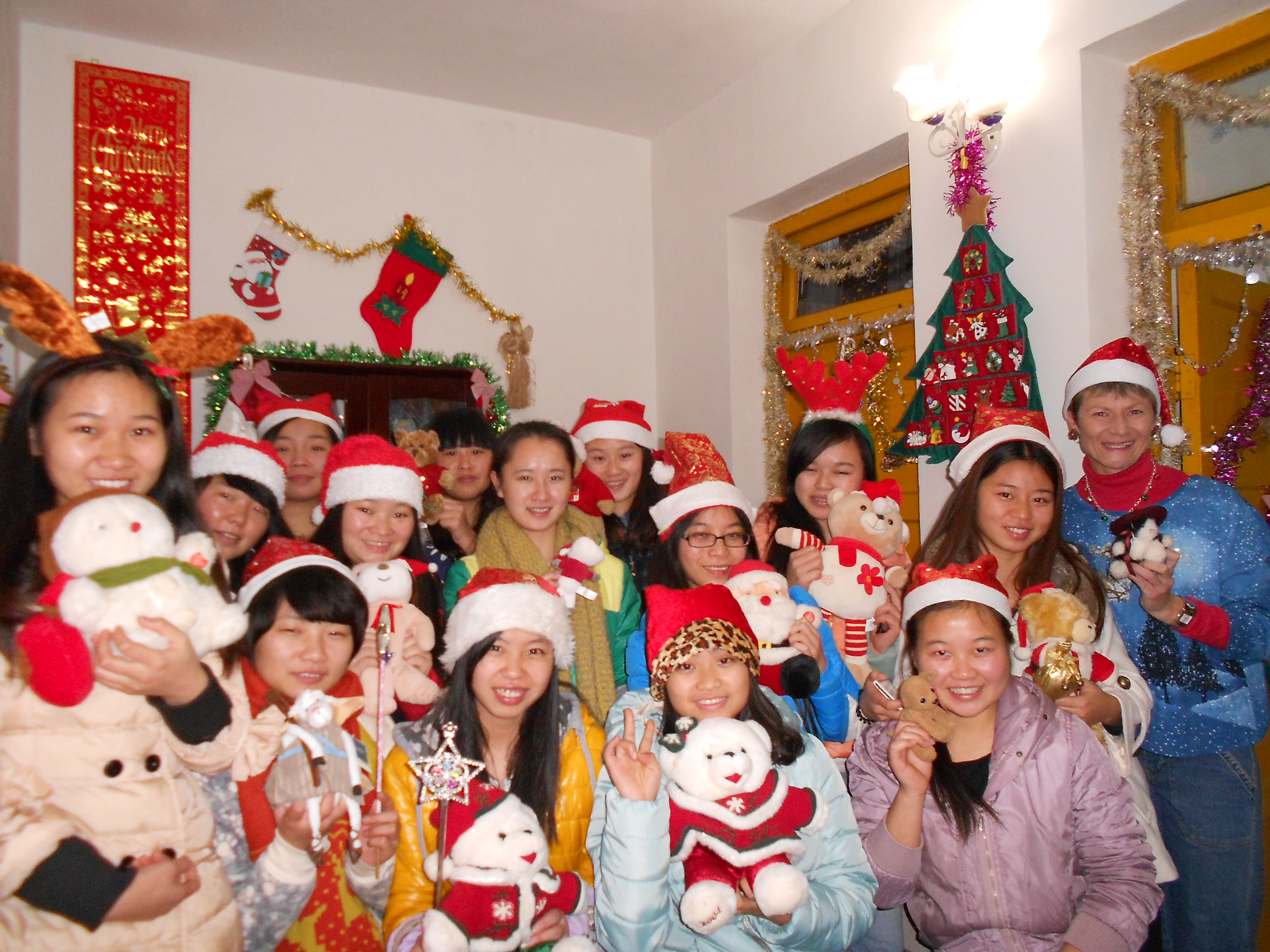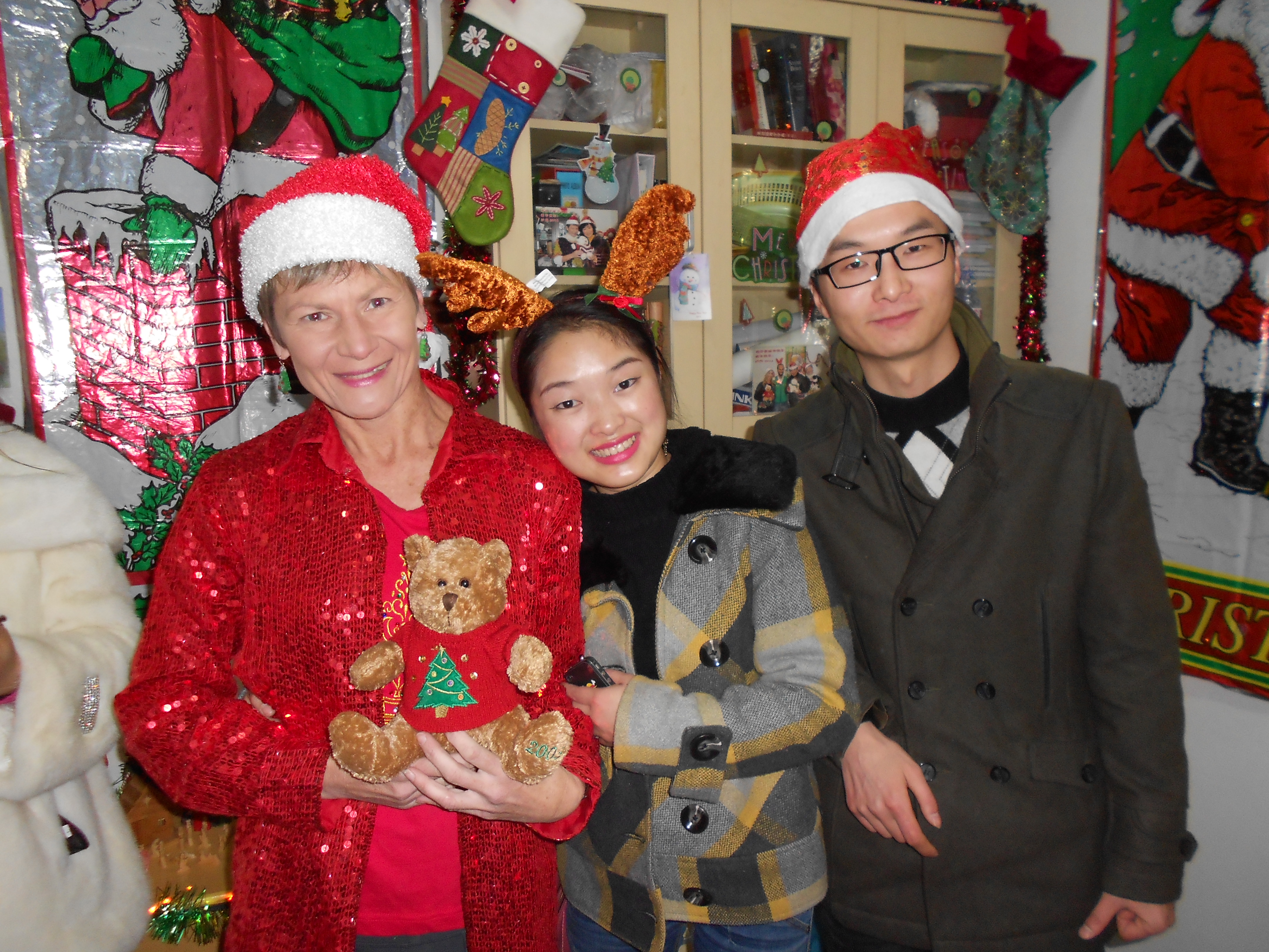 The Chinese teachers and staff need extra energy to get through their busy schedules at this time of year. That includes hours of test grading. My infamous cut-out sugar cookies, chocolate truffles, fresh tangerines, soft drinks, coffee and tea gave all who attended a feeling of the true Christmas spirit, as shown by us 3 Americans.