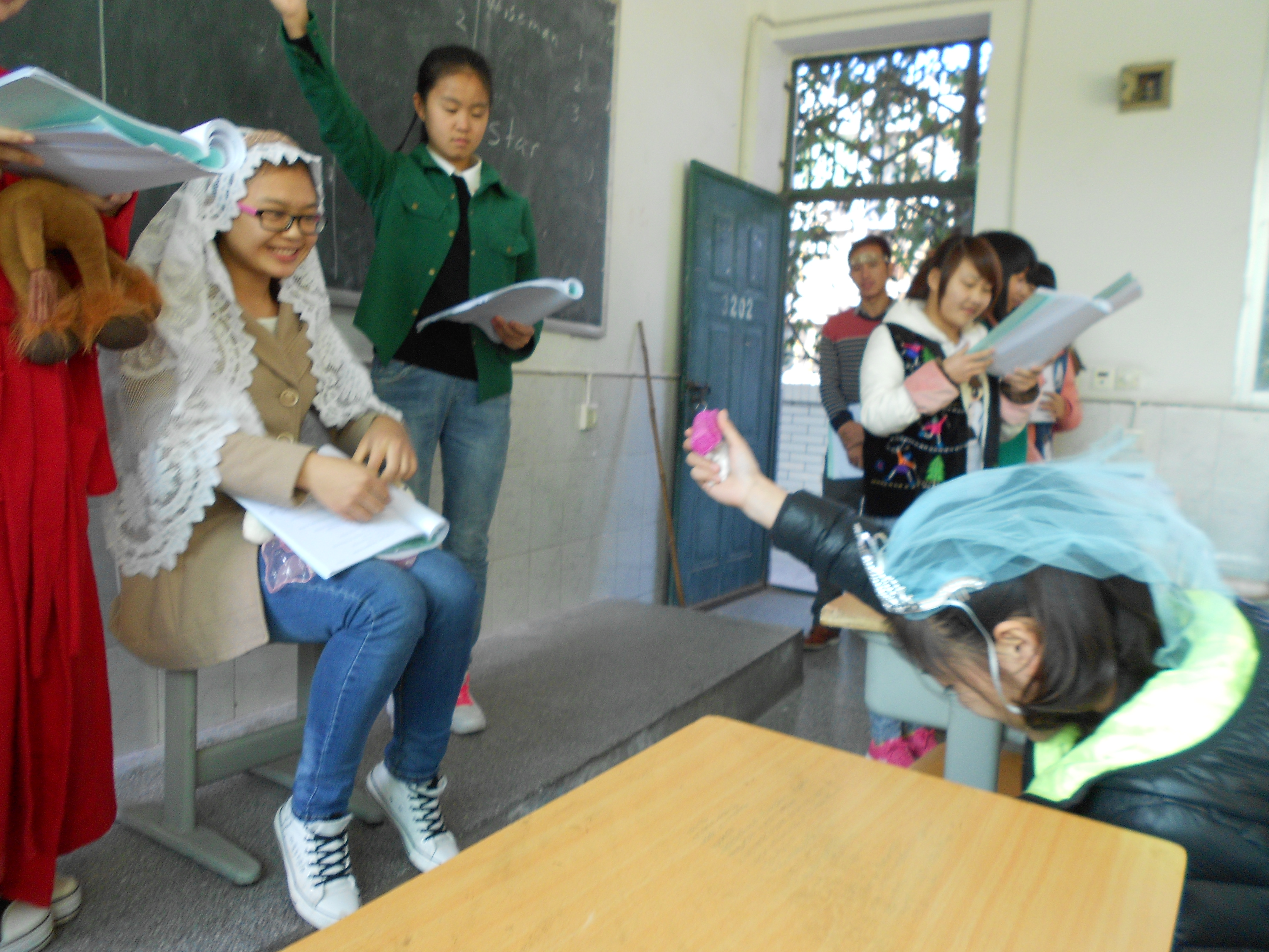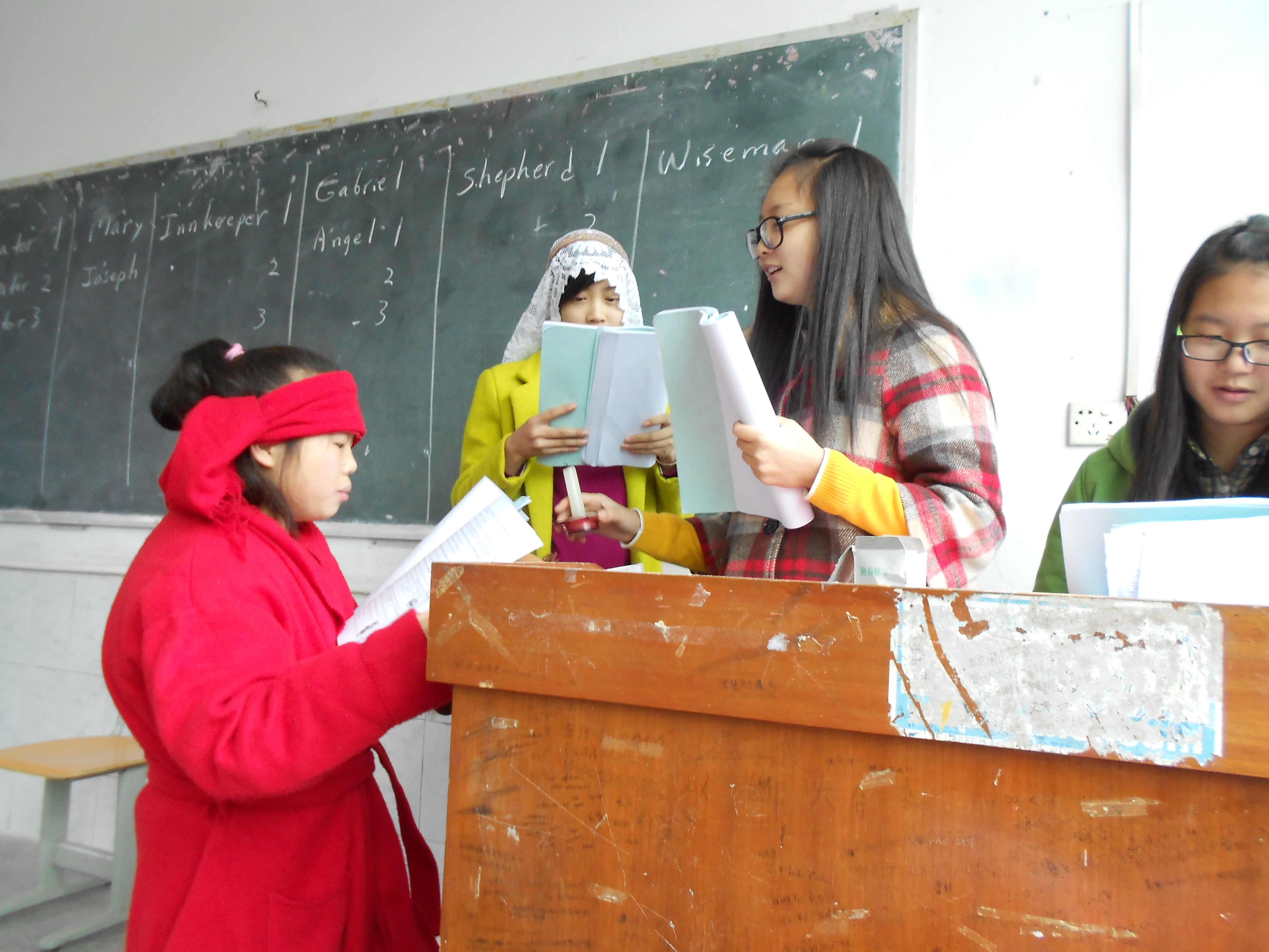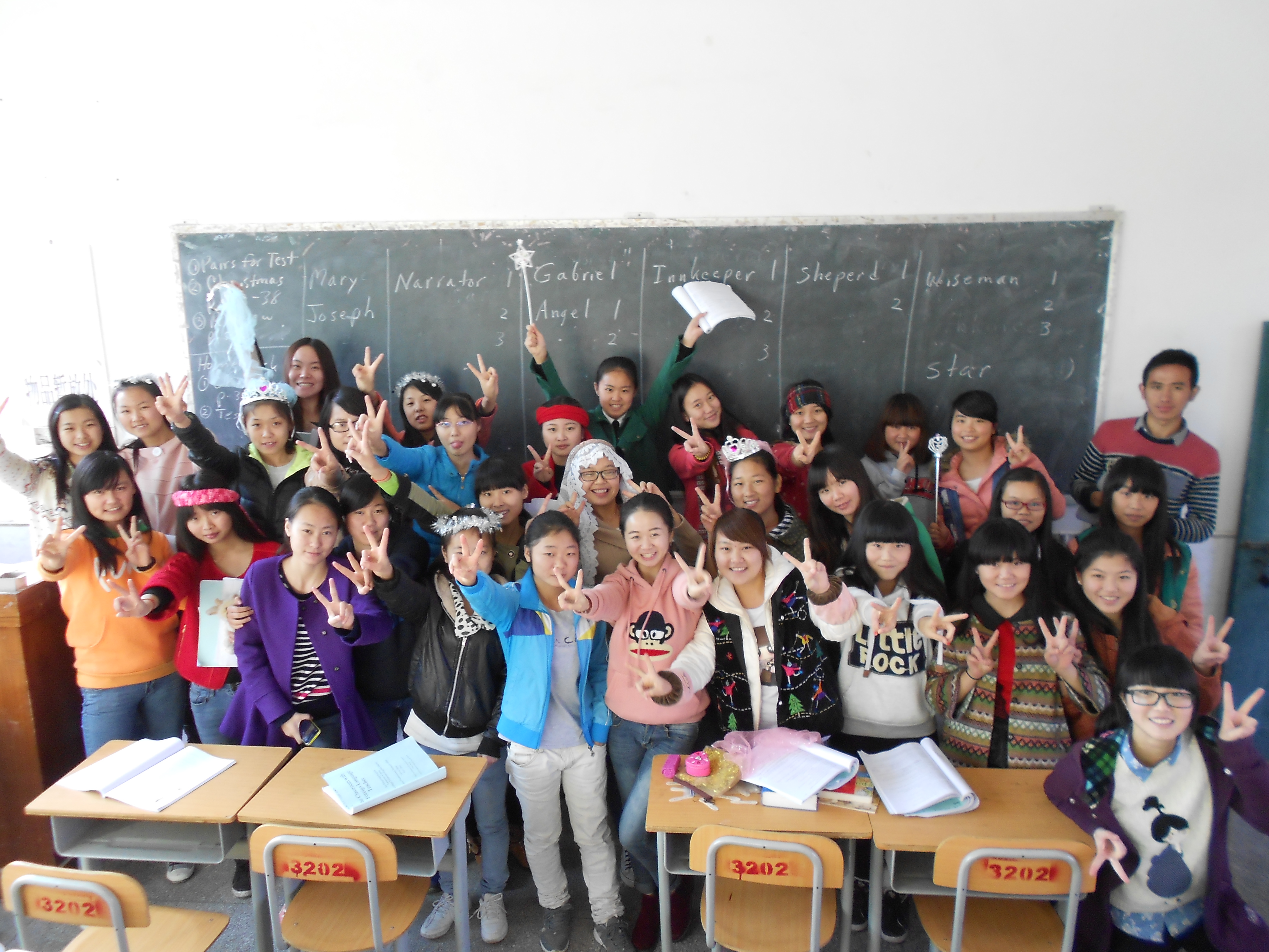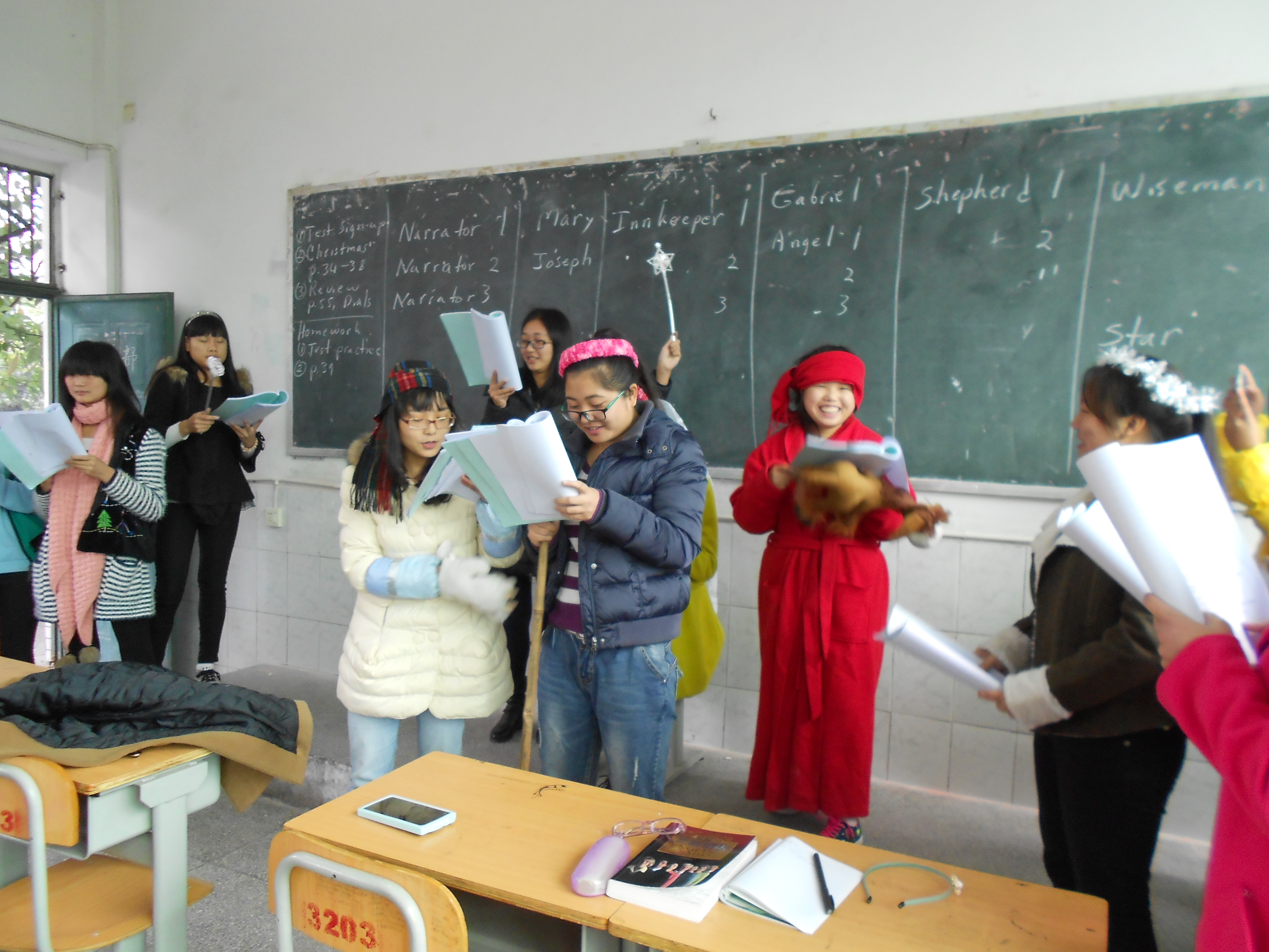 The Chinese teachers and staff need extra energy to get through their busy schedules at this time of year. That includes hours of test grading. My infamous cut-out sugar cookies, chocolate truffles, fresh tangerines, soft drinks, coffee and tea gave all who attended a feeling of the true Christmas spirit, as shown by us 3 Americans.