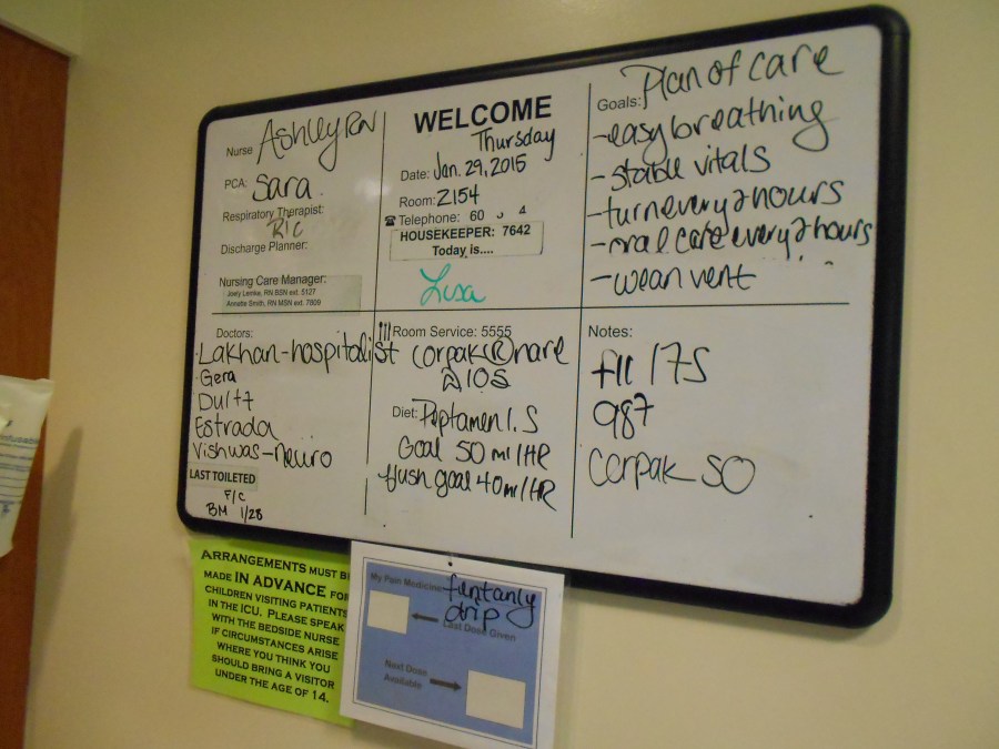 In the hospital room, a whiteboard is written on for information.