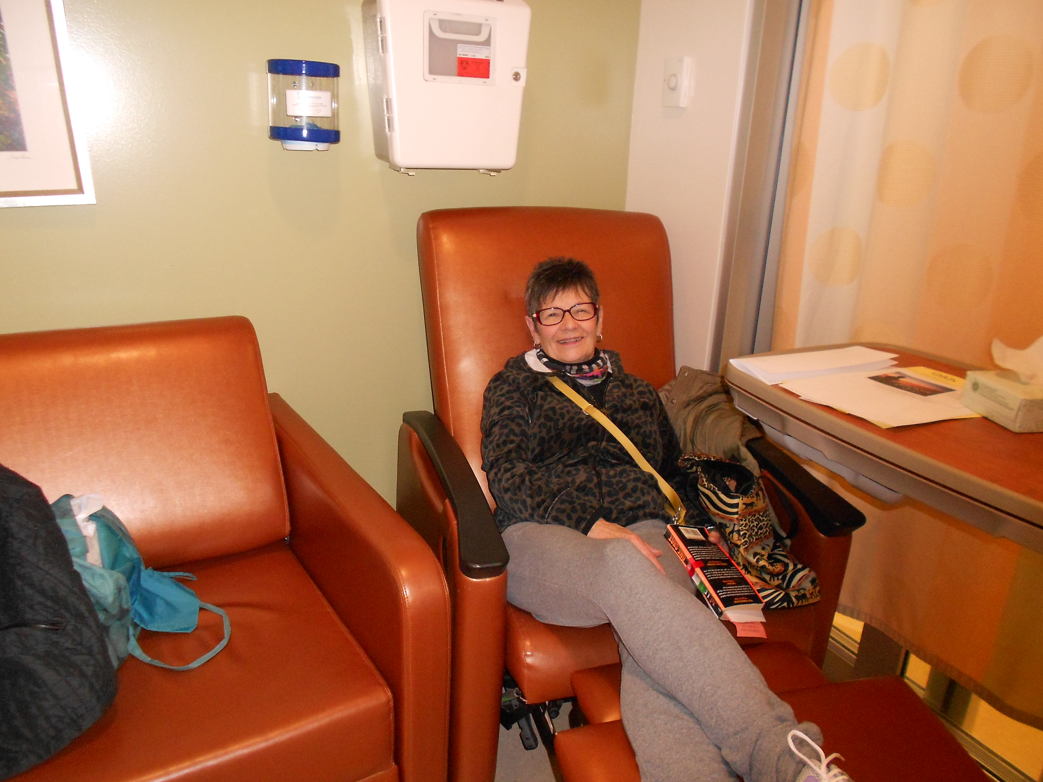 My mom in my dad’s hospital room. Two lounge chairs are for those of us visiting.
