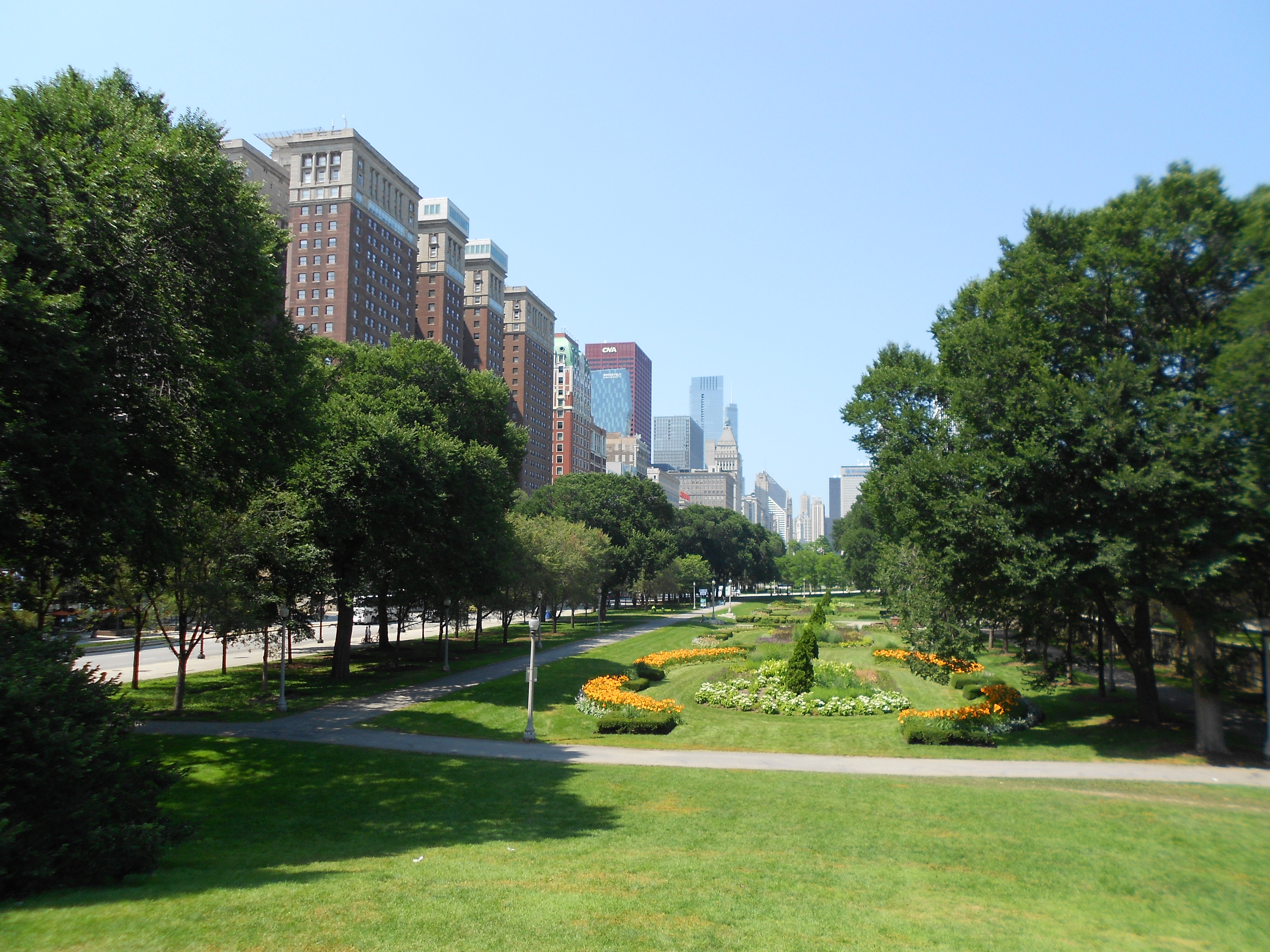 The beauty of Chicago’s many parks. The Conrad Hilton Hotel (1927) is on the left, taking up practically an entire block