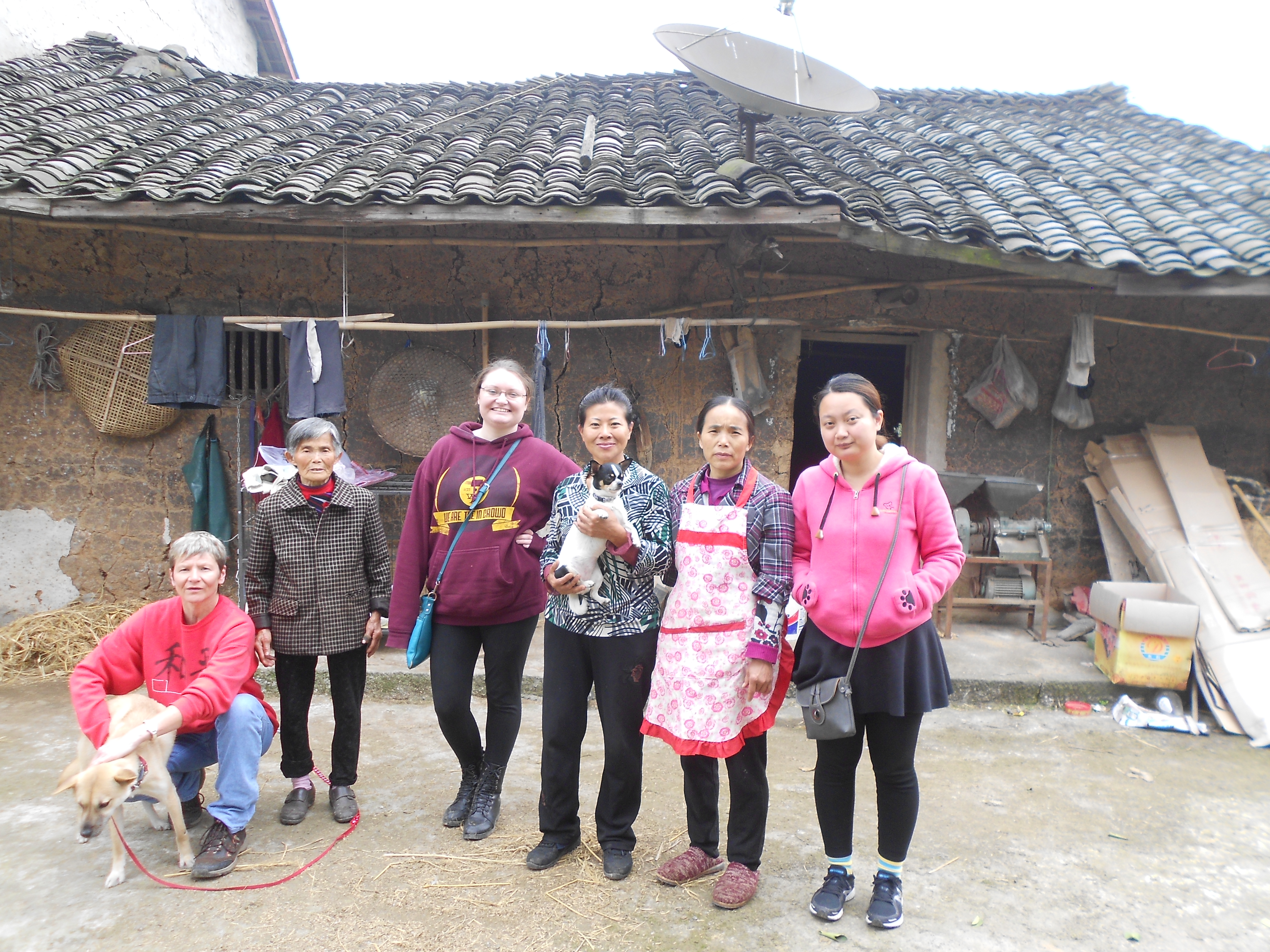 SP and her New Farming Family. From left to right: Me, SP, Grandma, Jackie (Peace Corp volunteer), Teacher Xue with Chiuahua Little Sister (Xue, English name being Snow, helped find SP a home), Mother Chen and Cici (Teacher Xue’s colleague)