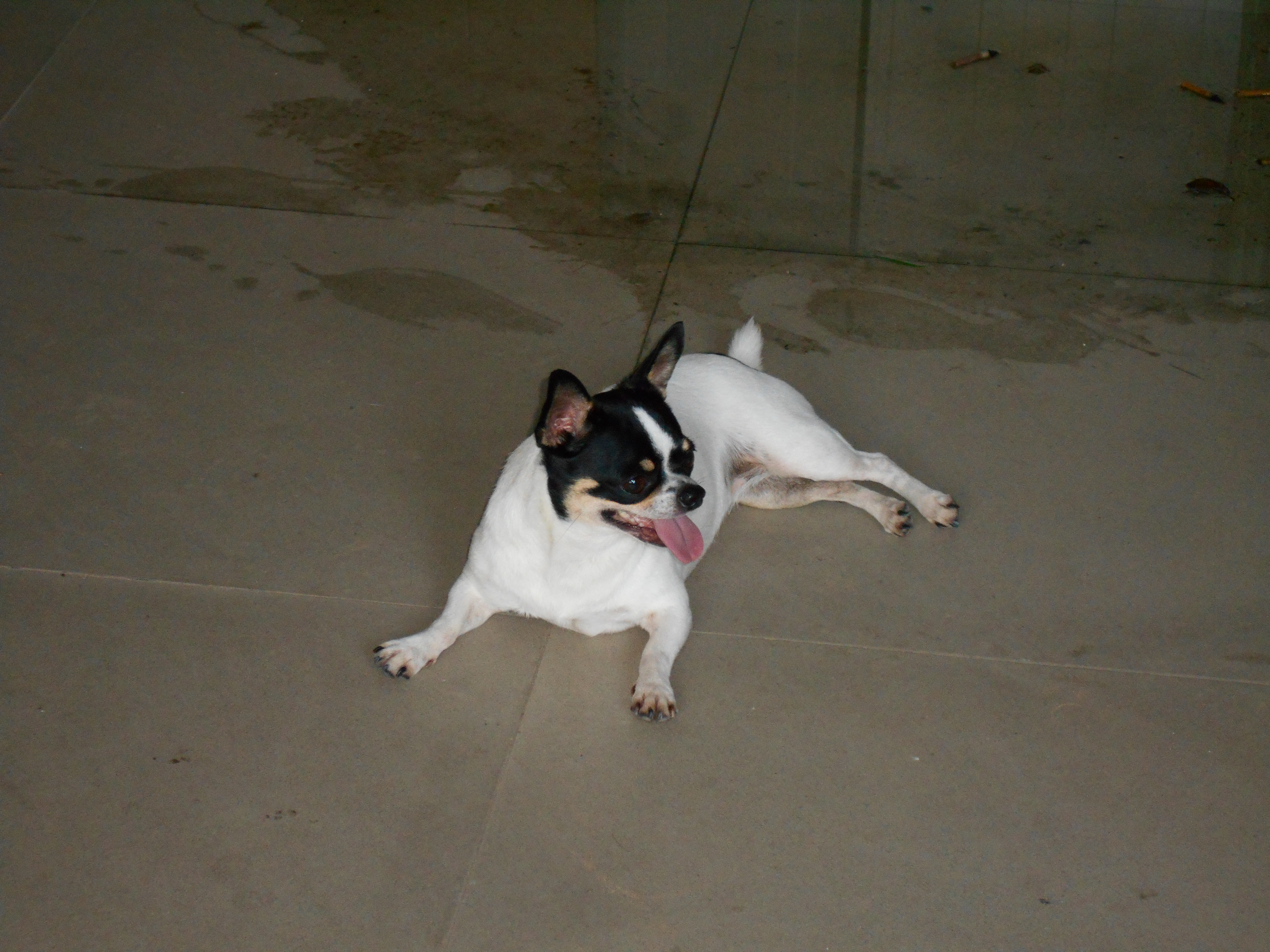 Stinky, the abandoned Yorkie at the clinic, has his pan of water soak after our short walks during our 100-degree weather days.