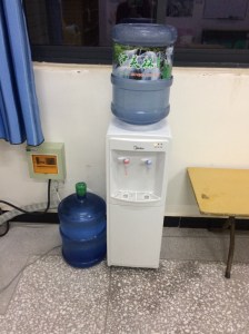 The English Language Resource Center has a 5-gallon jug water dispenser which has 2 levers: one for hot (to make tea or instant coffee) and one for cold. In China, we can’t drink water from the tap so many offices have water dispensers and order sanitized water to be delivered. I have my own water company that I use and I decided to use them for my resource room.