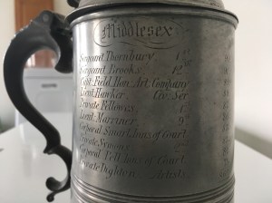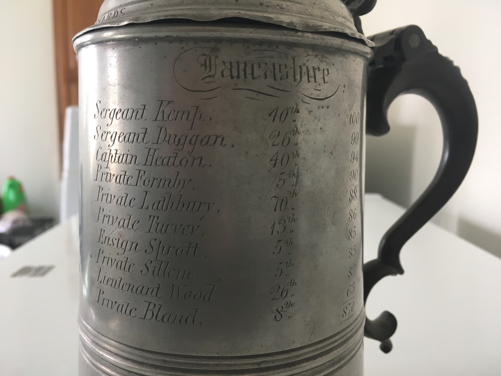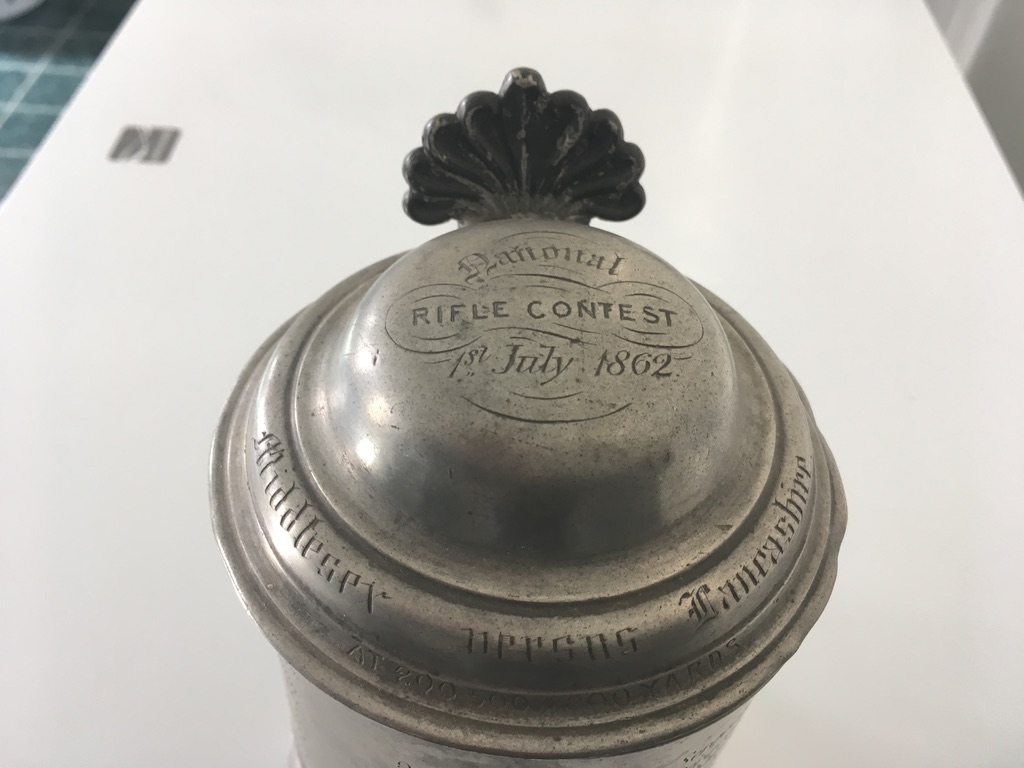This wasn’t a mere drinking stein at all but an engraved trophy for the National Rifle Contest, held on July 1st, 1862, between two rival rifle clubs: Middlesex and Lancashire.