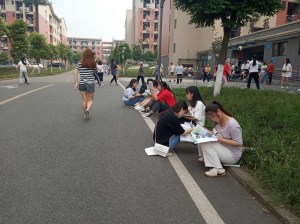 So as not to disrupt my schedule, I kept my regular teaching hours and just took everyone outside for a review class before the finals week.  Most Chinese students are not used to this sort of environment, having the freedom to break into small groups on their own and study outside of the classroom.  It was pretty darn hot that morning, soaring into the 90s, which gave me some concern as to how this would go over but I needn’t have worried.