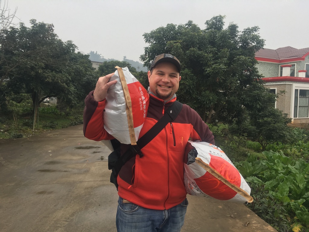 Xiao Liu-liu (Little 6) was a perfect dog for the countryside and Mrs. Chen was excited to have him. I sent him to her in October and just visited him before returning to America in January. What a big boy he has become! With the help of former Peace Corp volunteer, Brian, and my former Chinese student, Angel, we carried 4 bags of dog food which I felt was enough to keep him well-fed until my next hoped-for visit in March, after the New Year’s holidays ended.