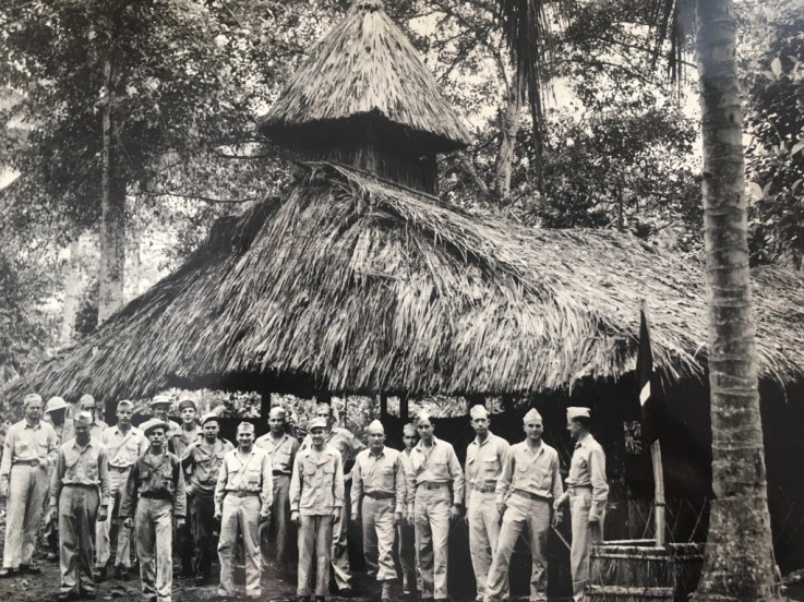 Chaplain Maris, first row on the far right, organized the men to build the first chapel in the jungles of New Guinea, where he watched over the men’s spiritual needs during the war. Sunday service attendance was sometimes quite low.