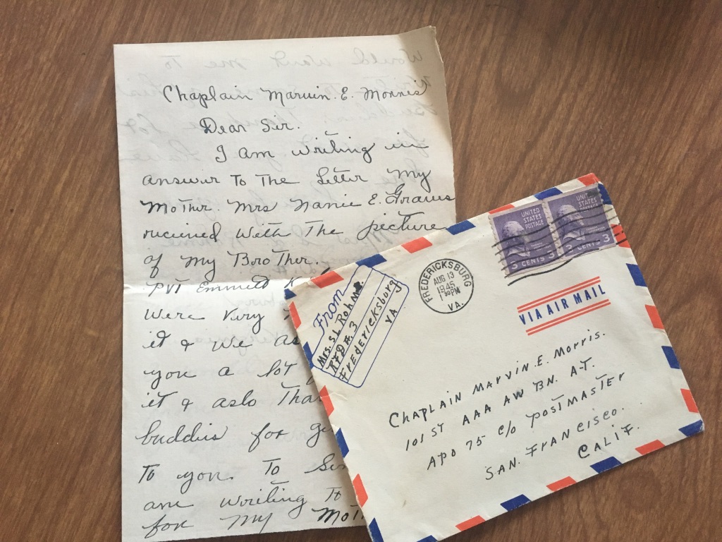 Tossed among the many correspondence letters in the bins, I found a few written to Marvin from soldiers’ family members. I’m uncertain why he kept some and not others but the ones he did preserve are telling.
