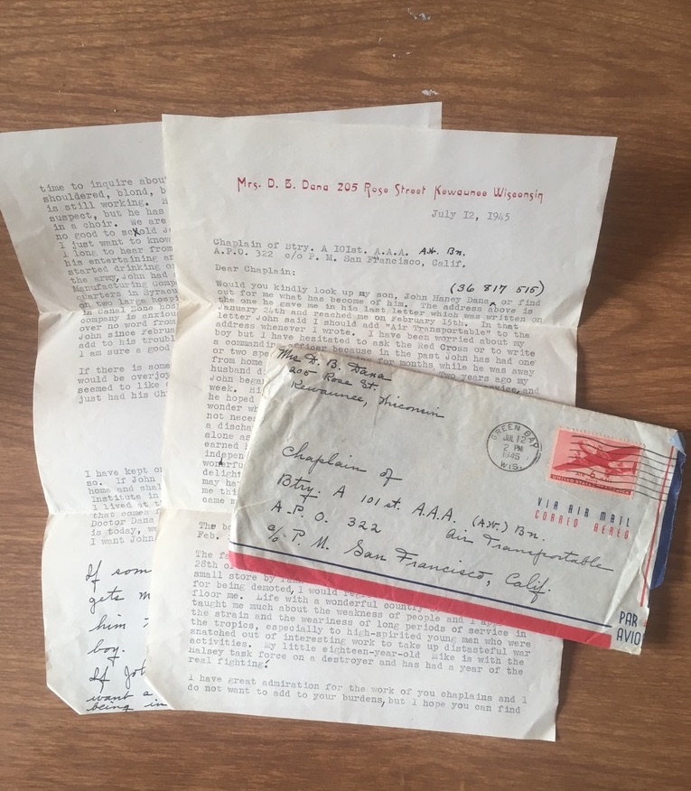 I have great admiration for the work of you chaplains and I do not want to add to your burdens, but I hope you can find time to inquire about my boy.  He is 6 ‘ 11″, heavy, broad-shouldered, blond,blue-eyed and he has a nice smile, if that is still working.  He neglects attendance at church, I suspect, but he has a background of church-going and singing in a choir.  We are Congregationalists.  I know it would do no good to scold John as he is touchy and would resent it. I just want to know what has happened to him and, of course, I long to hear from him.  I certainly miss the bolstering of his entertaining and lovely letters. I hope he has not started drinking or become irresponsible.  Before going into the army, John had a very fine job representing the Kewaunee Manufacturing Company in New York State and he had headquarters in Syracuse, New York.  He did a big piece of work on two large hospital installations of laboratory furniture in Canal Zone hospitals just before he was drafted.  The companies anxious to have John back and they are worried, too, over no word from John.  Not one person I know has heard from John since February.  If the boy is in wrong, I do not wish to add to his trouble and that is why I am writing you because I am sure a good chaplain has an understanding heart.