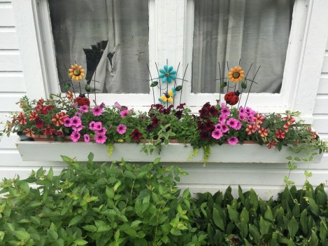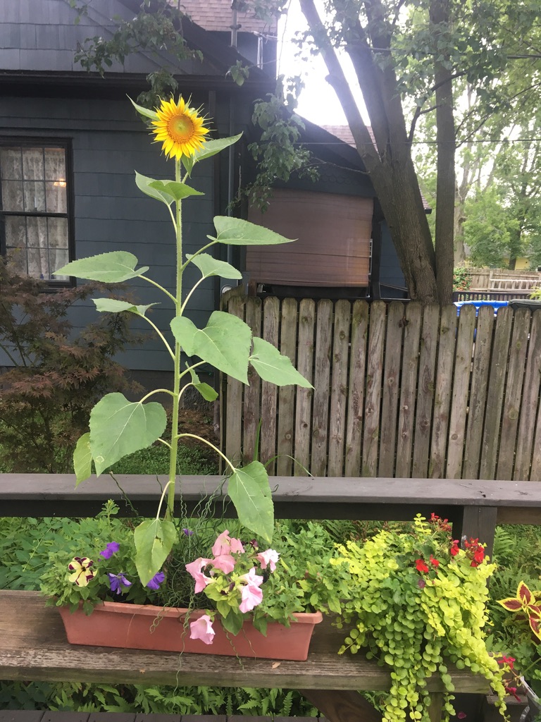 From our kitchen window, we’ve been watching this surprise start-up sunflower, a product of our back deck’s wildlife antics of dropping seeds here and there. Welcome, little sunflower, to our home!