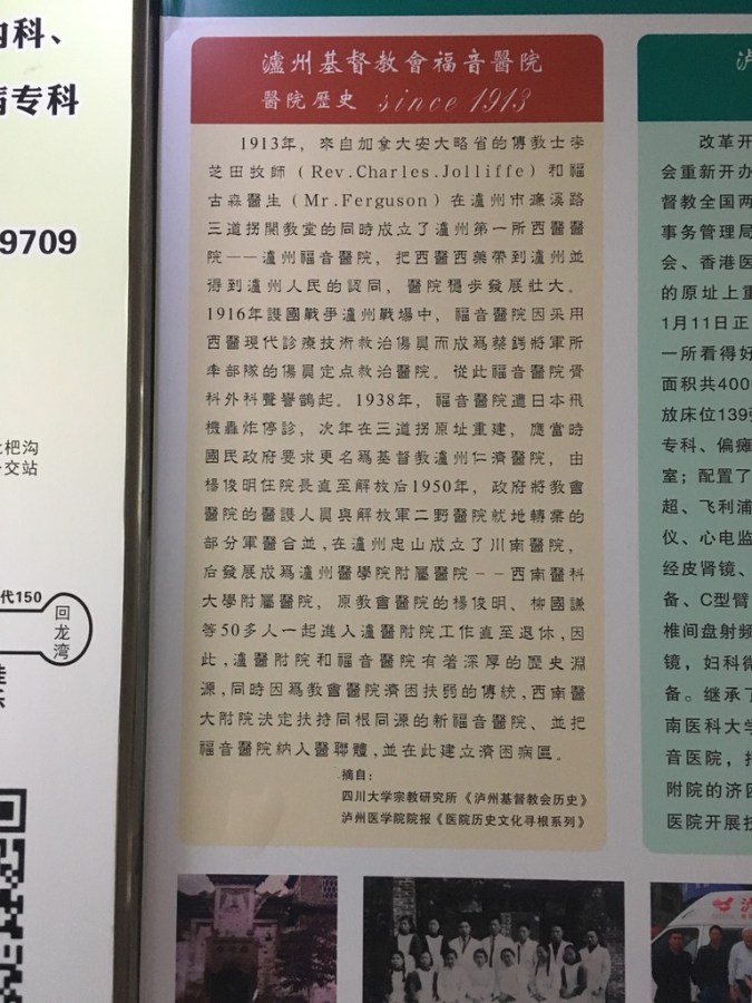 Panels in the Gospel Hospital explain the history of why medical mission is a strong part of the church. (The first medical dispensary in the province was established in Luzhou, as well as training of nurses and doctors by missionaries.)