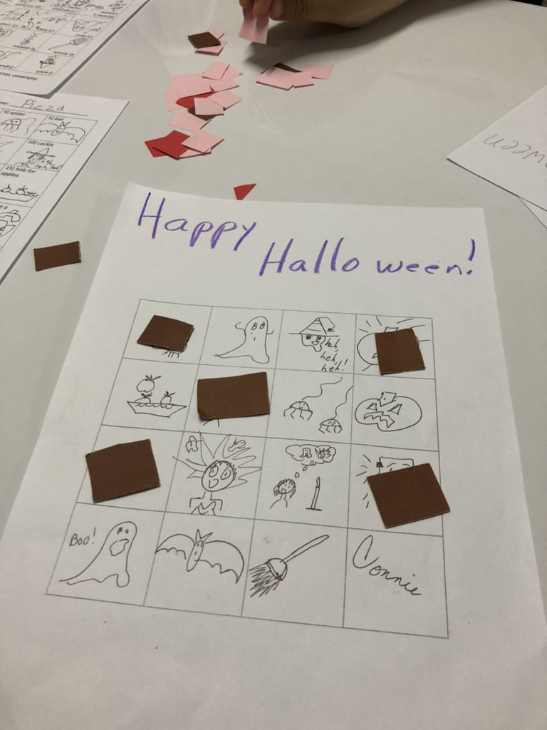 Our bingo game had students making their own bingo cards of 16 vocabulary drawings on Wednesday and then Thursday had us playing the game itself. It demanded a shout and stand-up of “Happy Halloween!” if 4 Halloween visuals, which students drew themselves, were in a row. We teachers likewise made our own cards so we could join in the classroom community as just one of the kids. Students took turns being the one to call out the vocabulary according to the cards. Prizes were stickers or candy, your choice.