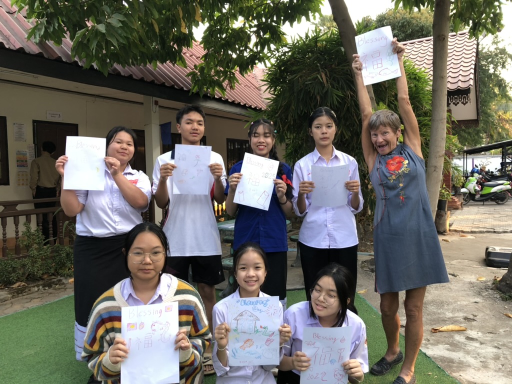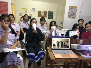 You will notice one adult is with us, Nok, who is an extremely dedicated elementary school teacher. She joins my class for free, wanting to improve her pronunciation and use some of my lessons, to teach her own students. I admire her so much. After a full day of teaching, she comes to my evening class from 5:30 – 6:30. I know she must be tired. Who would want to spend more hours with kids than needed, or even in a classroom? Yet she does so with enthusiasm and great desire to learn.